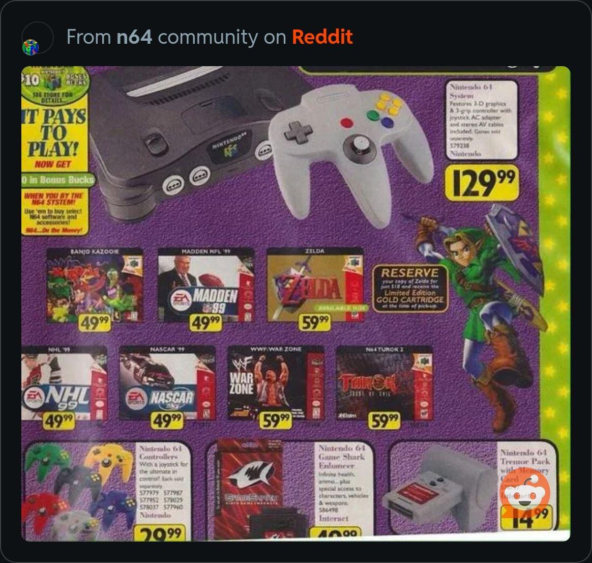 Without accounting for inflation, consoles have gotten more expensive, but games have been shockingly steady. Here’s a page from a Toys R Us ad from 1998 showing Ocarina of Time and other N64 games going for $60.