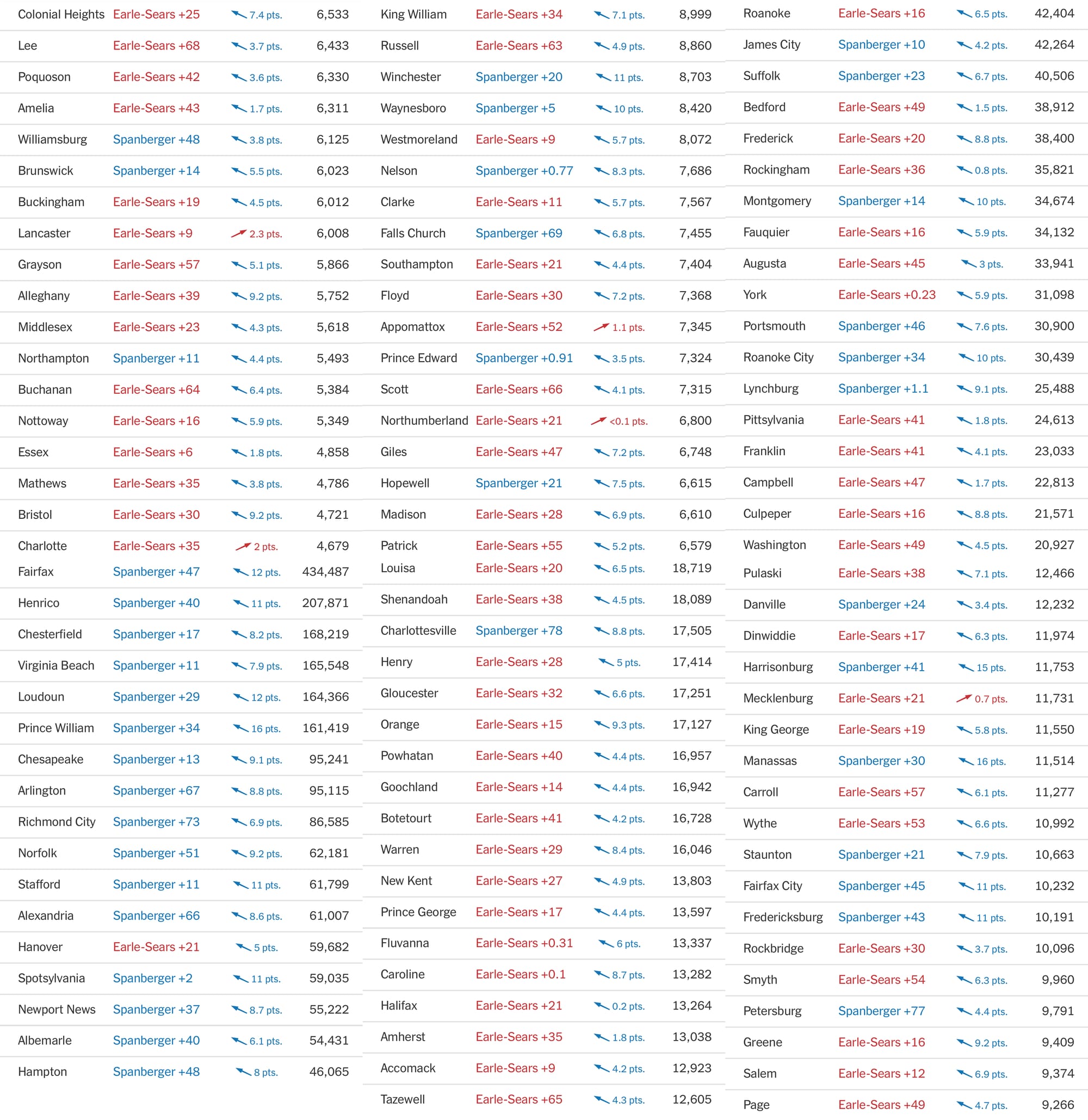 The data point we're looking at here is the arrow that is either blue or red and shifts right or left. As you can see, with scant few exceptions, every part of Virginia shifted left, sometimes by significant margins, over just one year ago. Yes, the Republican candidate won a decent number of counties. However, even in those cases, the margins came down from what they were a year ago. There are multiple variables here, and it could represent a general distaste for Republican policies, and it could also be an indicator that Donald Trump has a unique popularity that not all Republicans can replicate. Whatever the case may be, Virginia has a Republican governor today, and soon their new Democratic governor will be sworn in with a convincing victory.