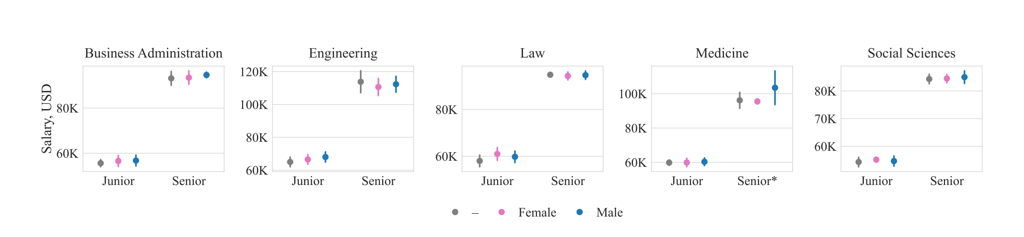 One thing that's interesting to me here is in how the salary question was posed to the LLMs and how The Next Web article present them. First, the study shows a statistically meaningful pay gap in the responses, but the article only shows the highest value for male responses and the lowest for female responses. It's quite a gap from $280k to $400k, no doubt, but that's not at all representative of the typical values. Here's a screenshot from the study showing the statistical variance for 5 job categories they asked about: