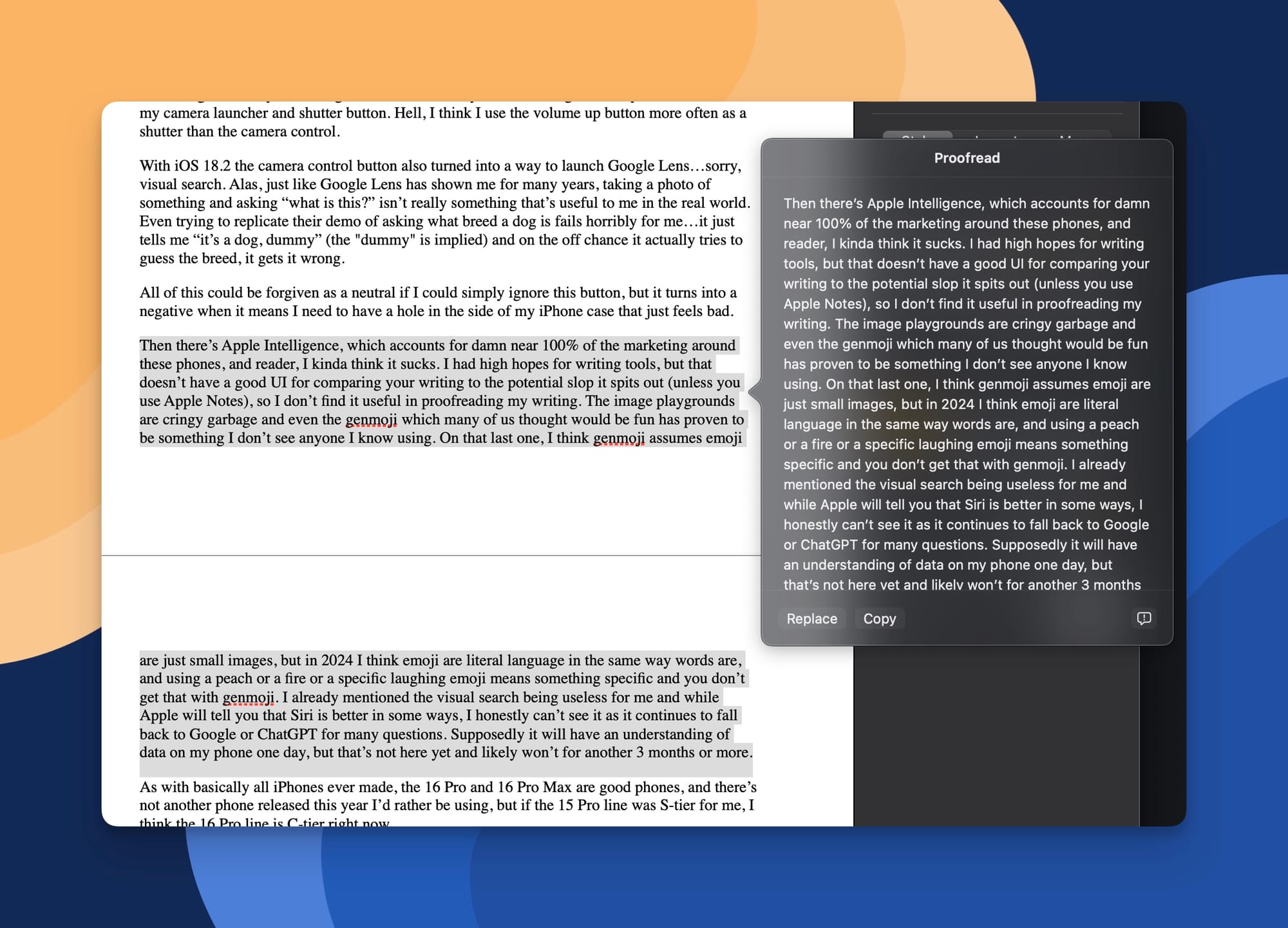 Then there’s Apple Intelligence, which accounts for damn near 100% of the marketing around these phones, and reader, I kinda think it sucks. I had high hopes for writing tools, but that doesn’t have a good UI for comparing your writing to the potential slop it spits out (unless you use Apple Notes), so I don’t find it useful in proofreading my writing.