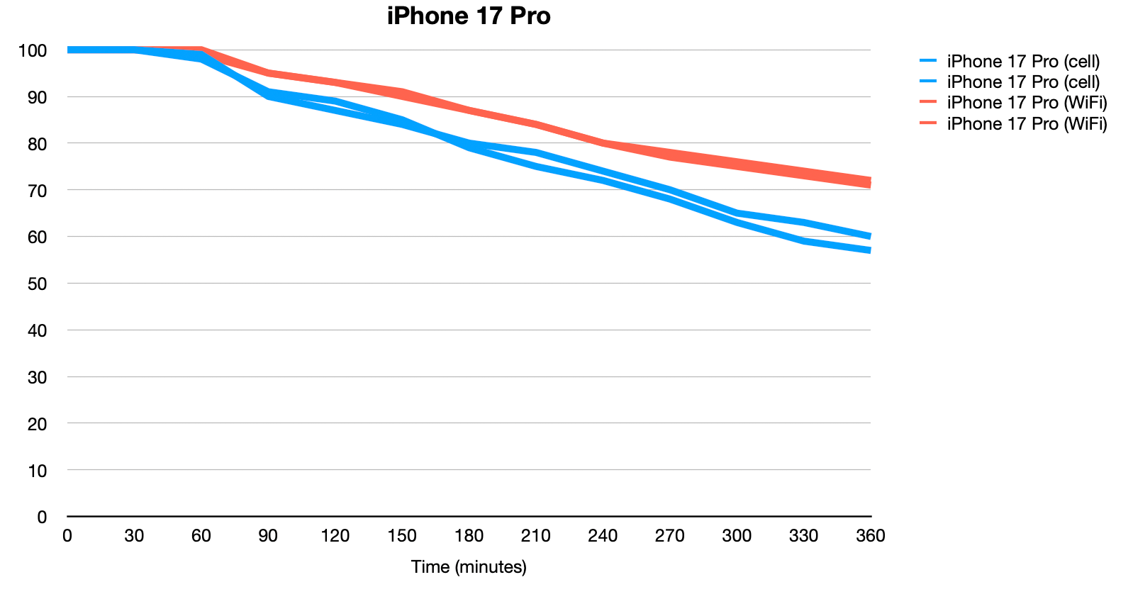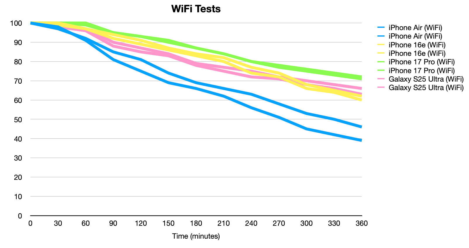 Of note, the iPhone 17 Pro and iPhone Air have Apple's new N1 chip which is used for WiFi, Bluetooth, and Thread. I don't think Apple lauded it for its efficiency, and based on these results, it doesn't seem to be a major uplift here (although I didn't compare to previous iPhones, so maybe it's doing something).