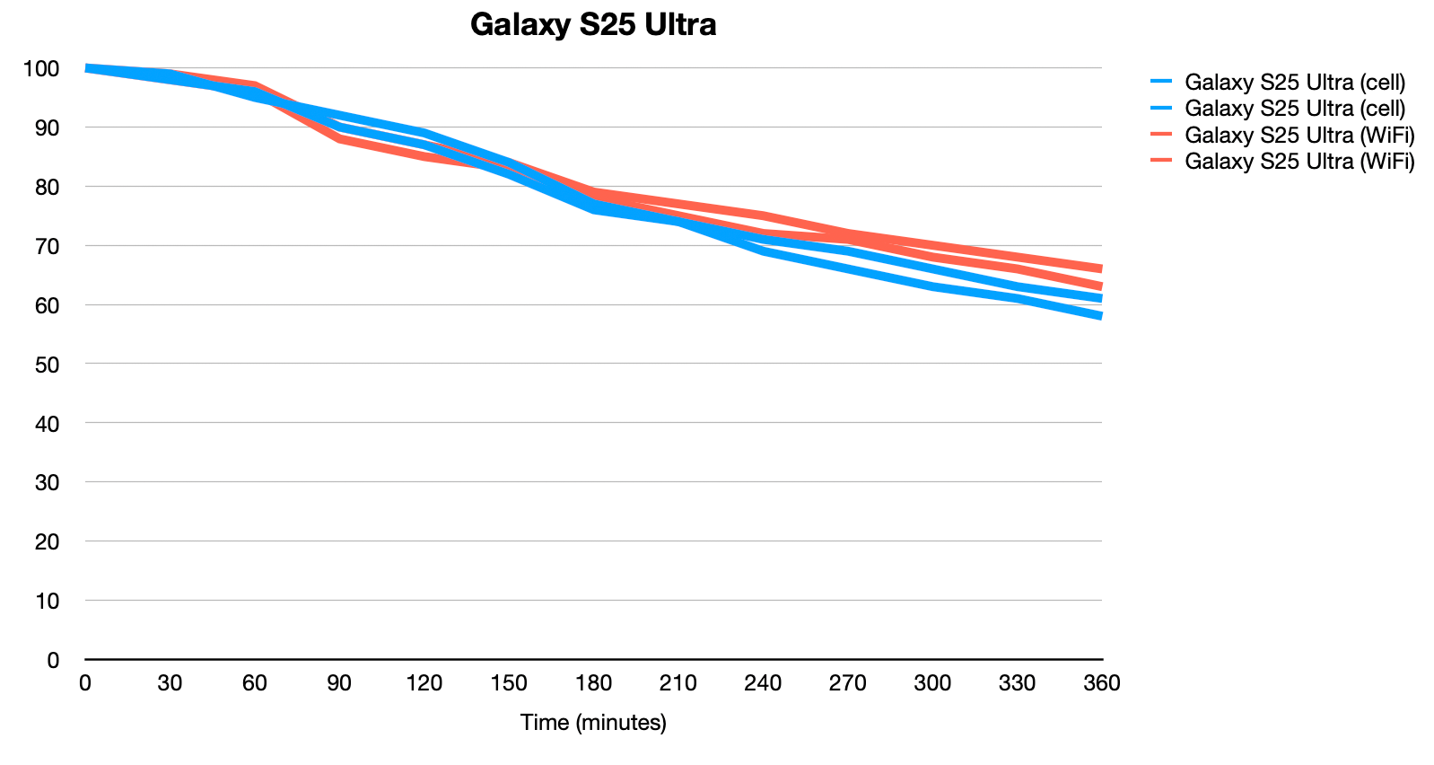 Looking at just the WiFi tests, we see something pretty well aligned with what I was expecting to see. The iPhone Air is clearly the worst performer, and was the only phone to drop below 60% at the end, dropping all the way down to 39% remaining in its worst result. Of note, the Galaxy S25 Ultra has a rated 60% (or so) more battery capacity than the Air, and the Ultra's worse result was 61% better than the Air's worse, so these are performing almost exactly as you'd expect from their battery sizes.