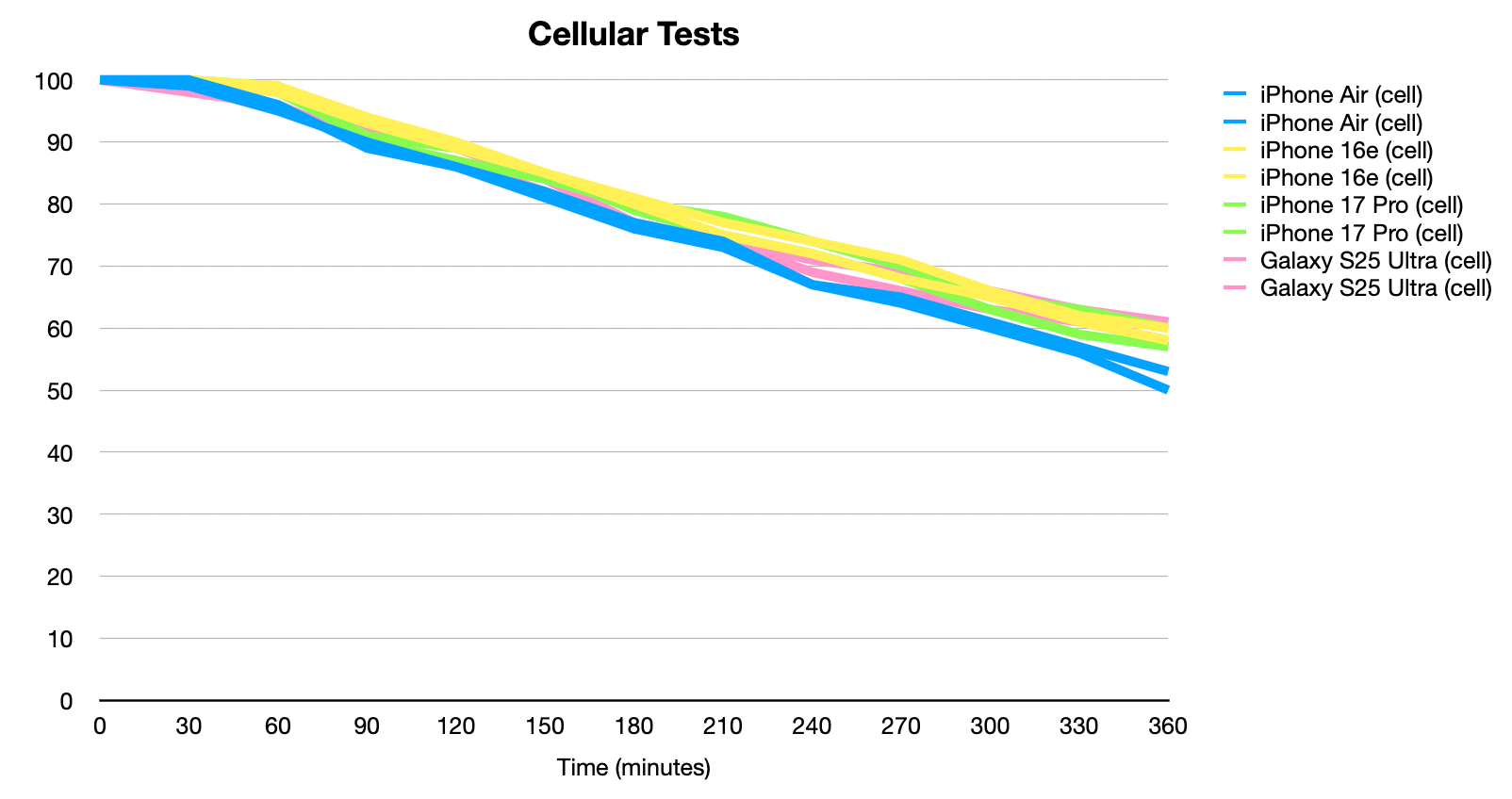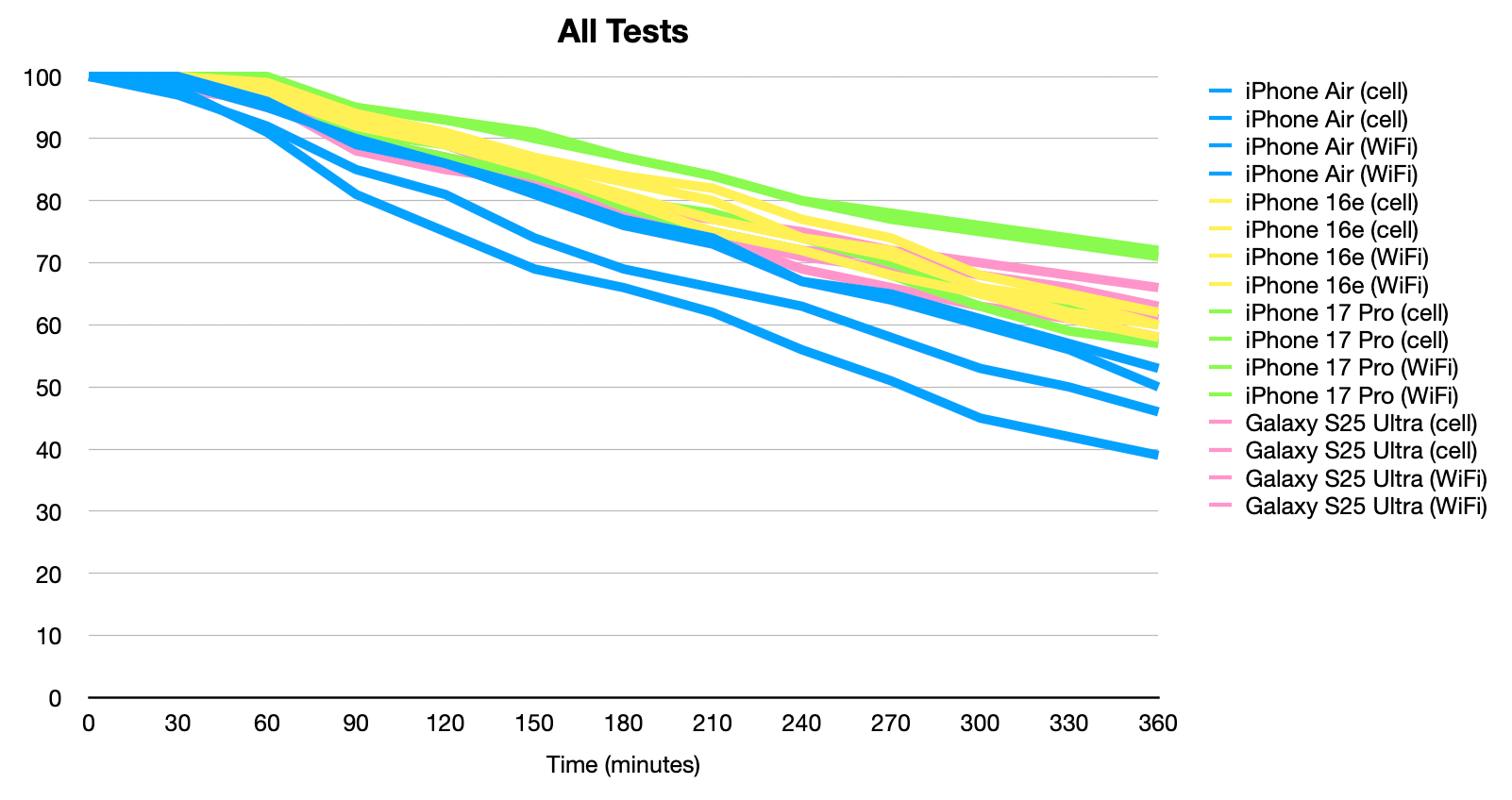 First, while the phones were generally consistent with how they chew through battery, there is some real variability in tests, so I'm glad I ran them several times. The iPhone Air, for example, ended up with 51% of it's battery remaining in one test, and 39% left in another.