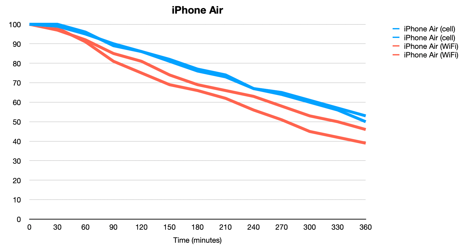 Three, I understand how the text way at the start of this post got the result it did. It was truly the best case scenario for the Air compared to the other iPhones: it was a cellular test, which it over-performs in, and it was compared to the European version of the iPhones, which have a 6% smaller battery than the eSIM-only version we get here in the US (the Air is eSIM only everywhere). If we take the best Air result from my tests (53% remaining) and take 6% off the worst 17 Pro result I had (57% remaining), the Air only loses 53% to 54%, which is well within the margin of error, and could swing the other direction since we've seen variability between tests.