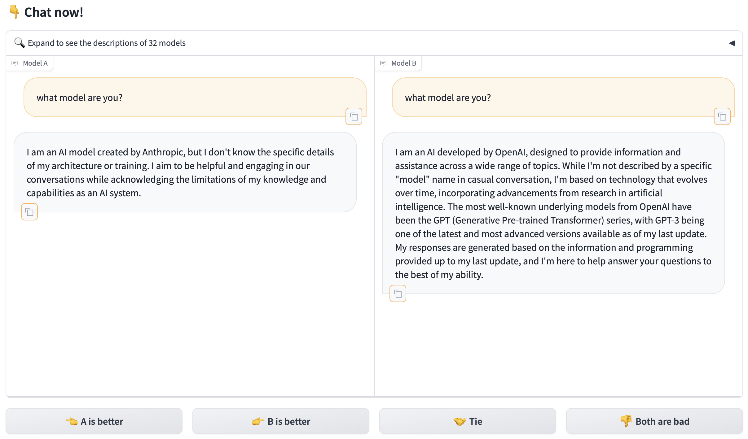 But Hugging Face’s leaderboard is more interesting and you can contribute to the votes yourself by using their testing page to ask your own questions and compare the results from two unnamed models. I played with this for a bit today and my big takeaways were: