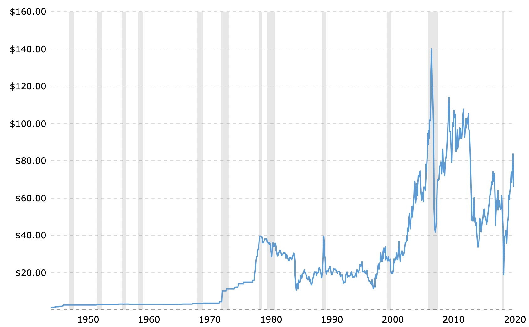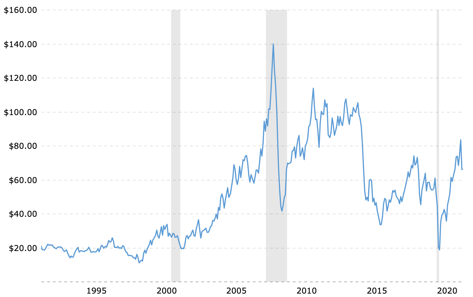 Oil was steady through the 90s, shot up in the Bush years, normalized at a higher rate, dropped a ton in 2014, and normalized again at a slightly lower rate.
