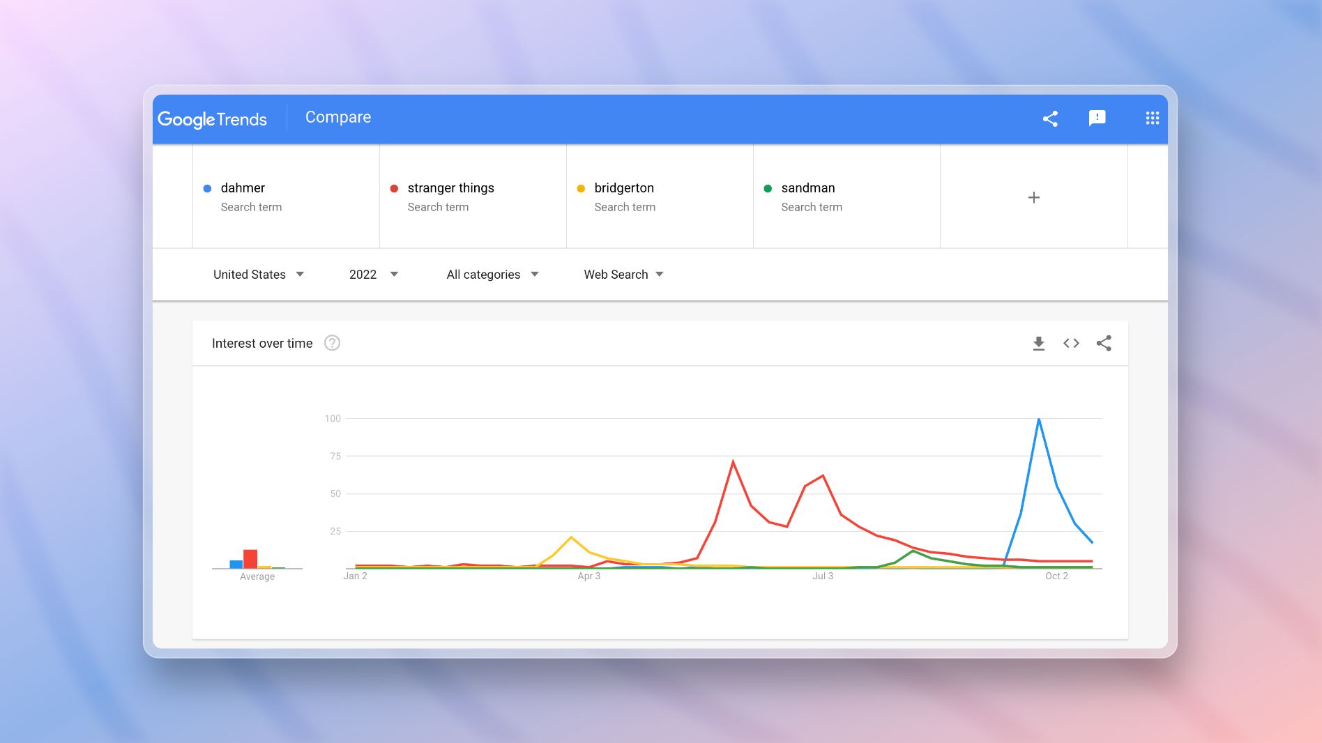 That's definitely true, but it also kinda shows that their Dahmer show was a unique phenomenon. Here's what that spike looks like compared to other big shows on Netflix in 2022: