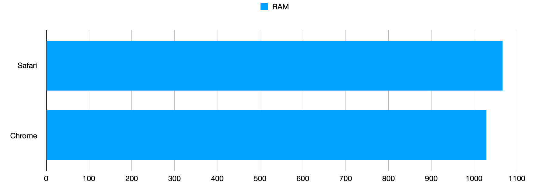 I know this will be the first thing people bring up, so this is what RAM usage was at after both tests. Safari us using more RAM, but it's in the ballpark, and based on the variability of RAM usage, I'm open to this result going to either camp depending on the run.