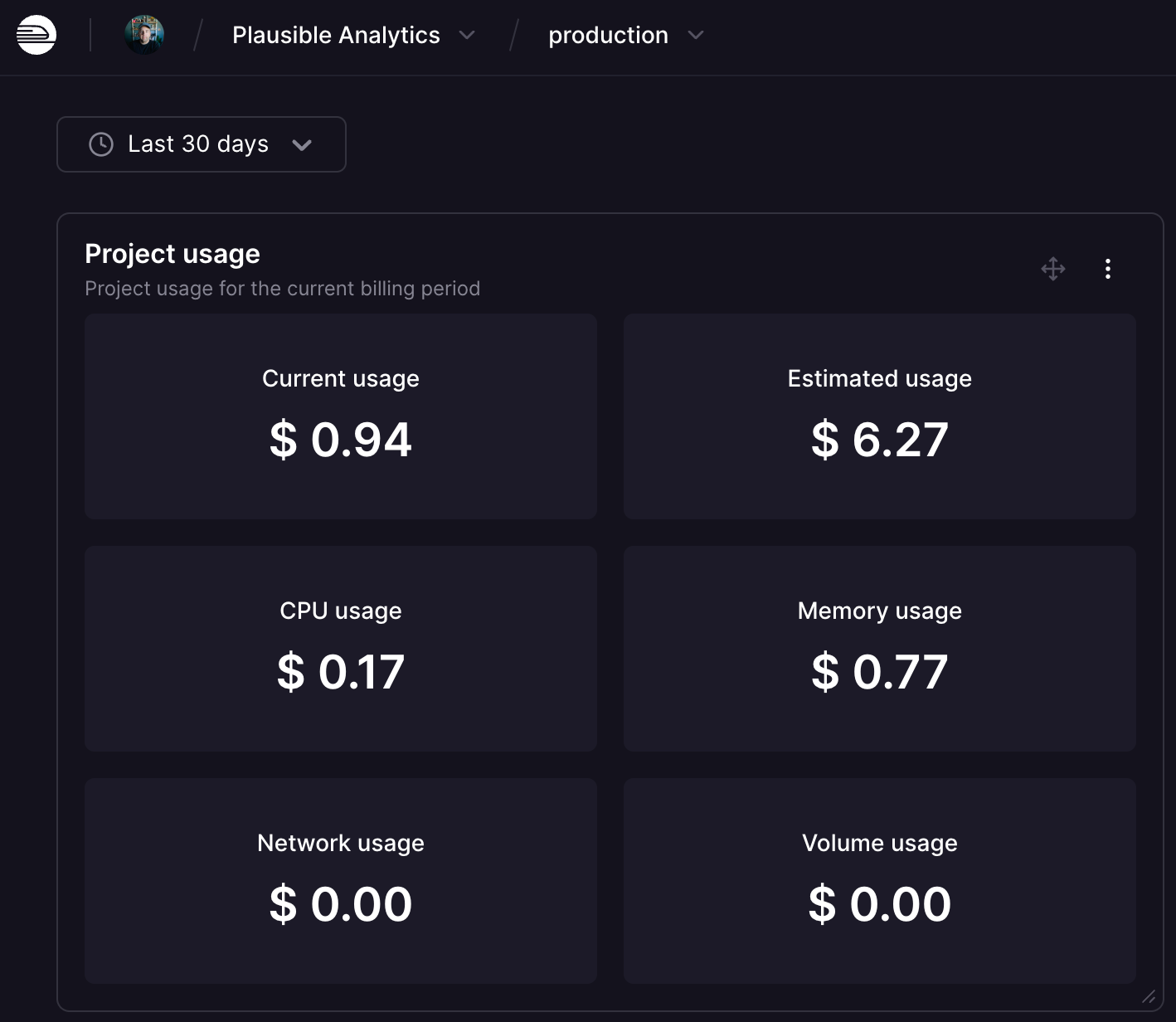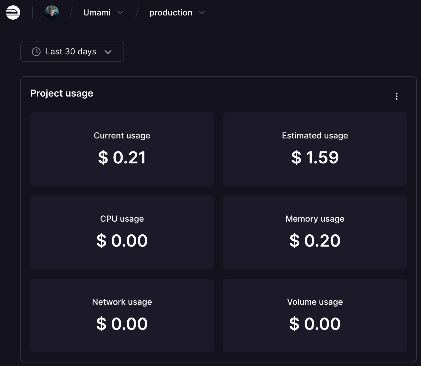 So I used Railway's one-click Umami install, got it running, and once again used Claude Code to quickly add the tracking code to each of the 5 sites I track. Over the exact same time period, here's what billing has accrued for this deployment.