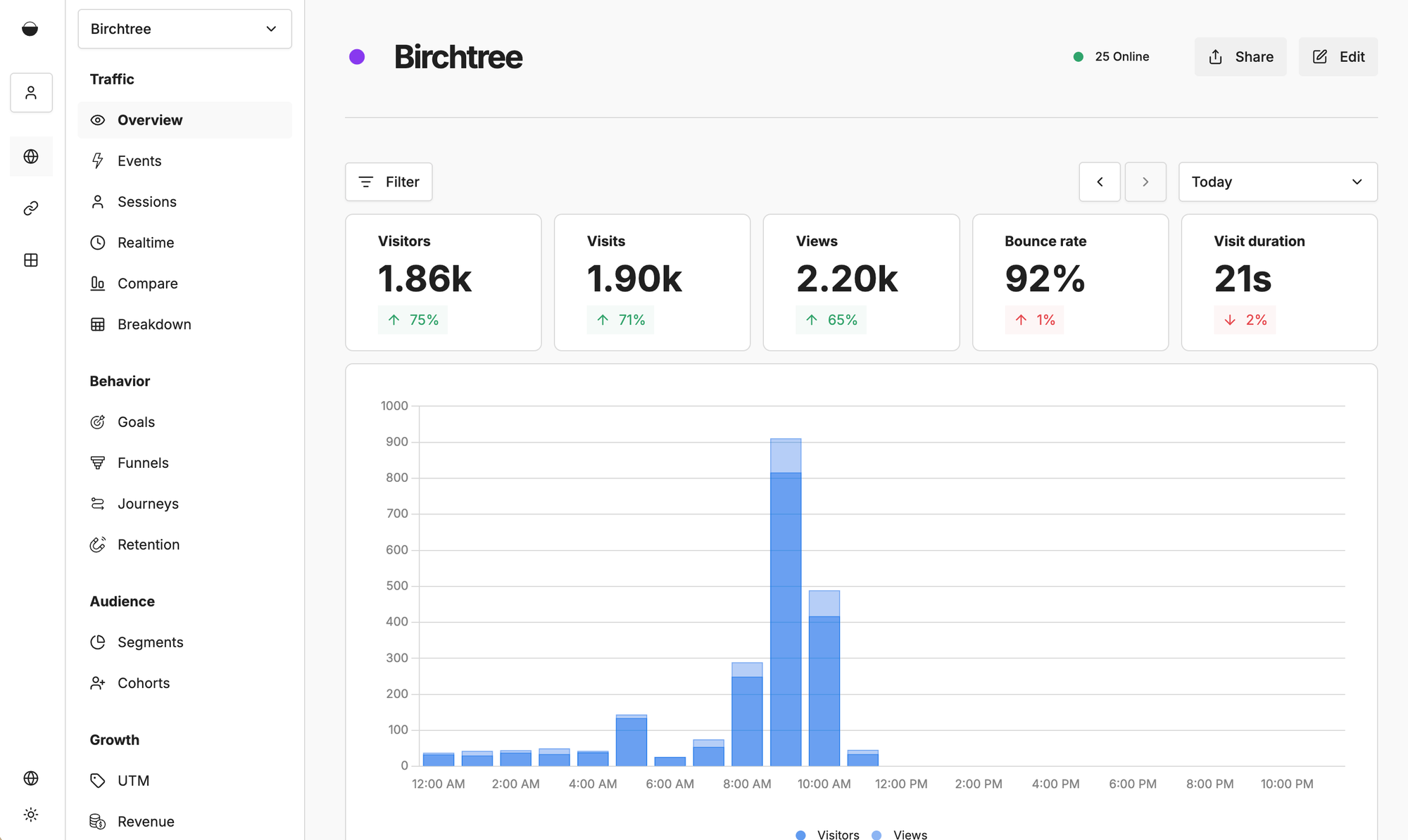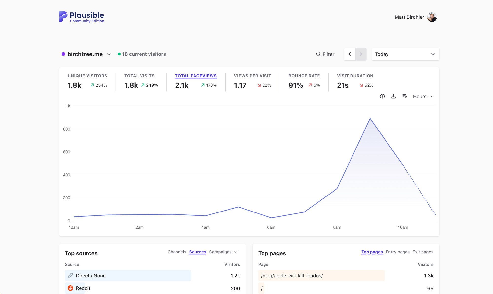 In case anyone was unfamiliar with these platforms, here's what the today view for Plausible looks like: