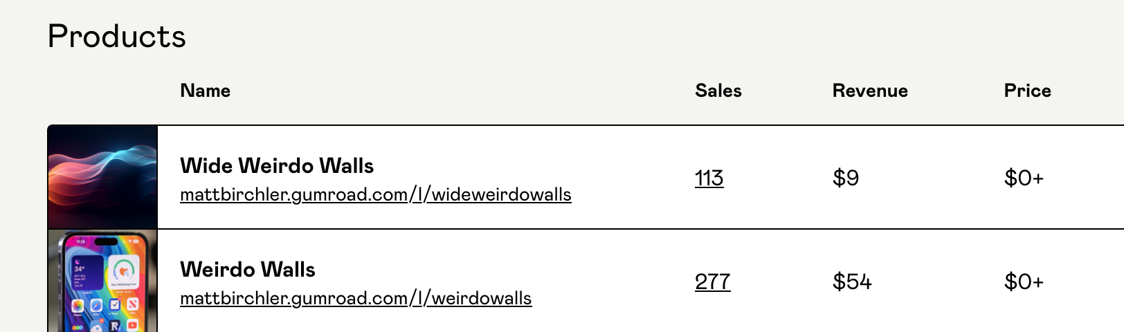 Back in March, I made a pack of iPhone wallpapers that I generated with Midjourney. A week later I did a follow up pack for computers and iPads generated the same way. I distributed them with Gumroad using the pay-what-you-want model, and 5 months later they’ve been downloaded 390 times, and I’ve made $63 from them.
