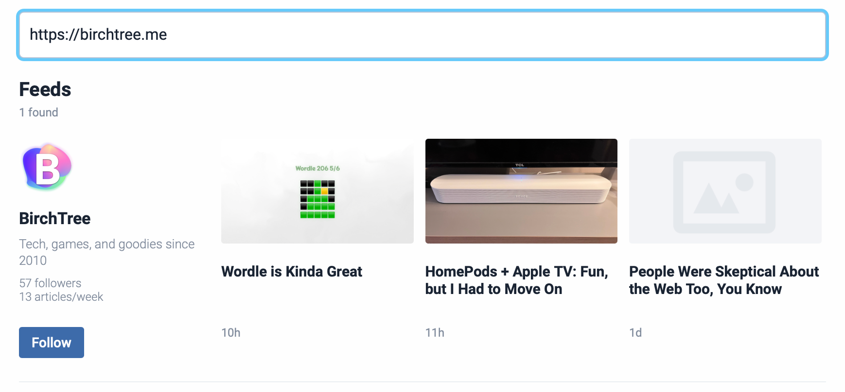 Gah, our first miss! There’s no feed here, so if you want to see the latest game releases, you gotta go to the page itself. That would admittedly be a very noisy feed, but I’m sure games journalists would like to be able to track new releases with ease.