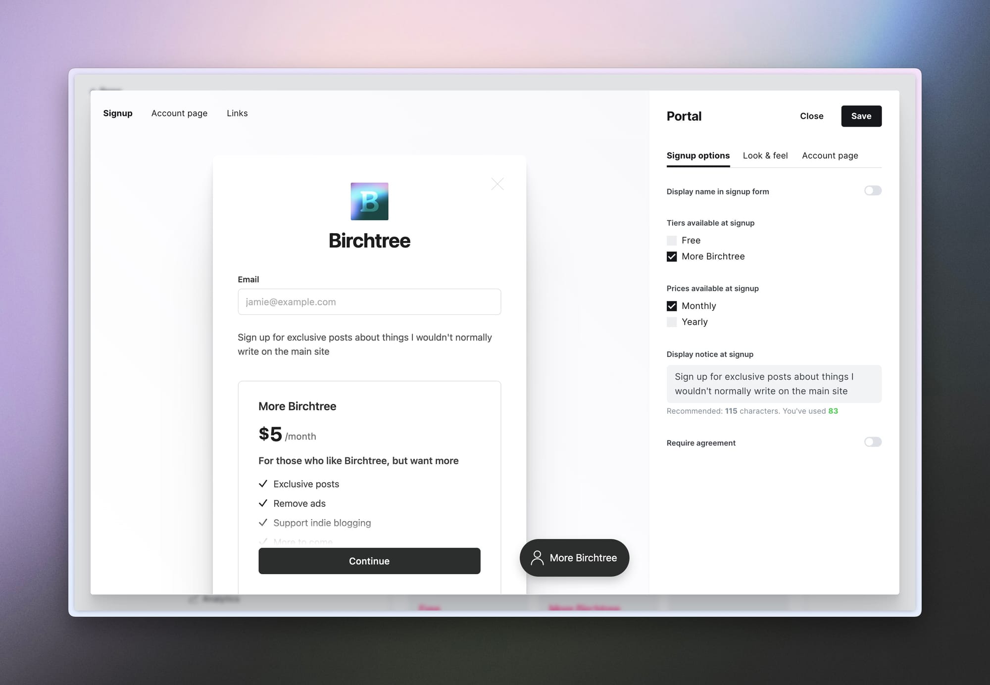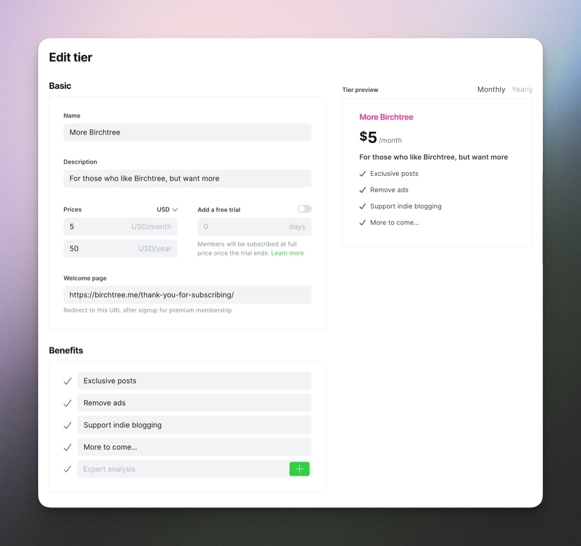 This isn't going to be a full tutorial, but yesterday I started a paid tier for Birchtree (sign up here) and in the interest of transparency as well as setting expectations for people who are thinking about doing something similar, here's the broads strokes of what's making this work.