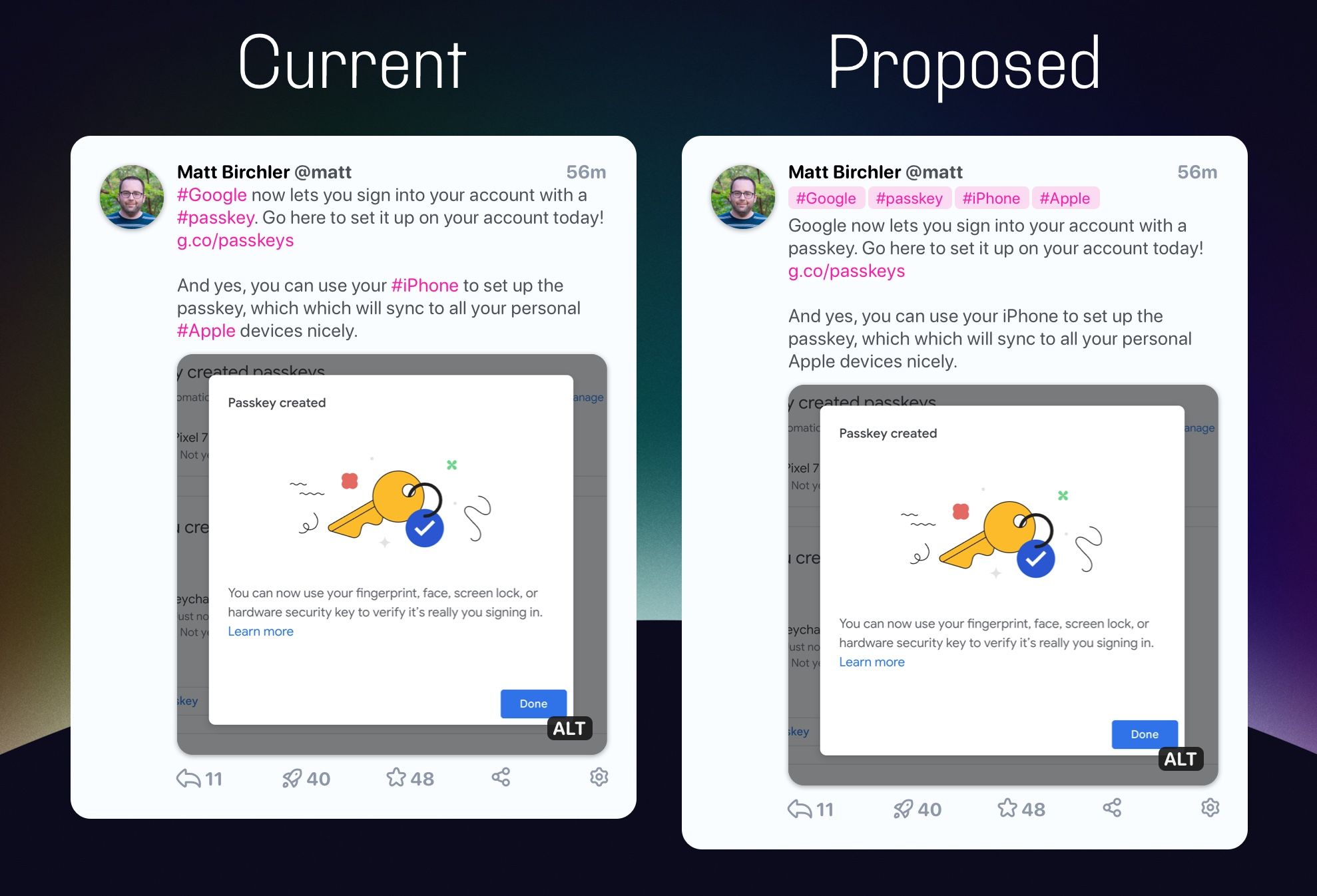 - This proposal would not take anything away from people who like hashtags and want to keep using them as they always have.