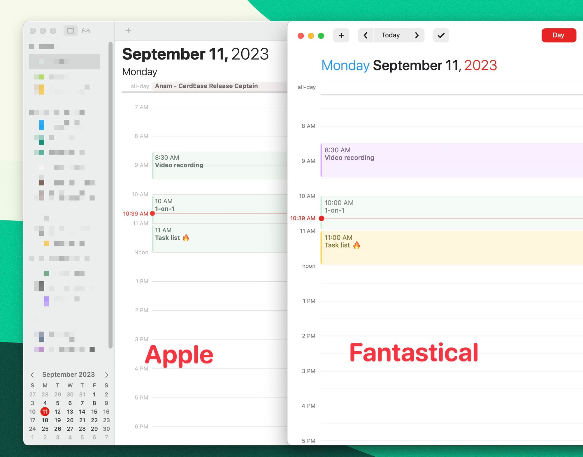 I tried to use Apple's Calendar app, but I ran back to Fantastical