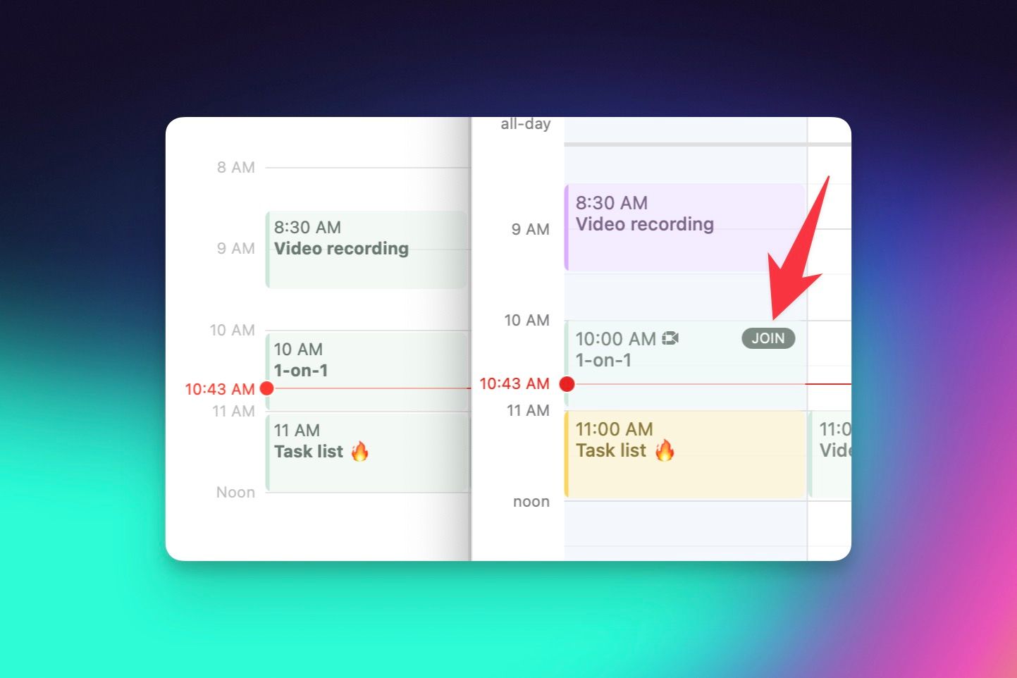Apple's Calendar app doesn't do this, and the only way to see that there is a video call associated with that 1-on-1 meeting is to double-click into it and see that there's a link. There is a "join" button when I click into the meeting details, but it's another step I'd prefer not to have, and again, the only way for me to know that there is a video call at all is to click into it.