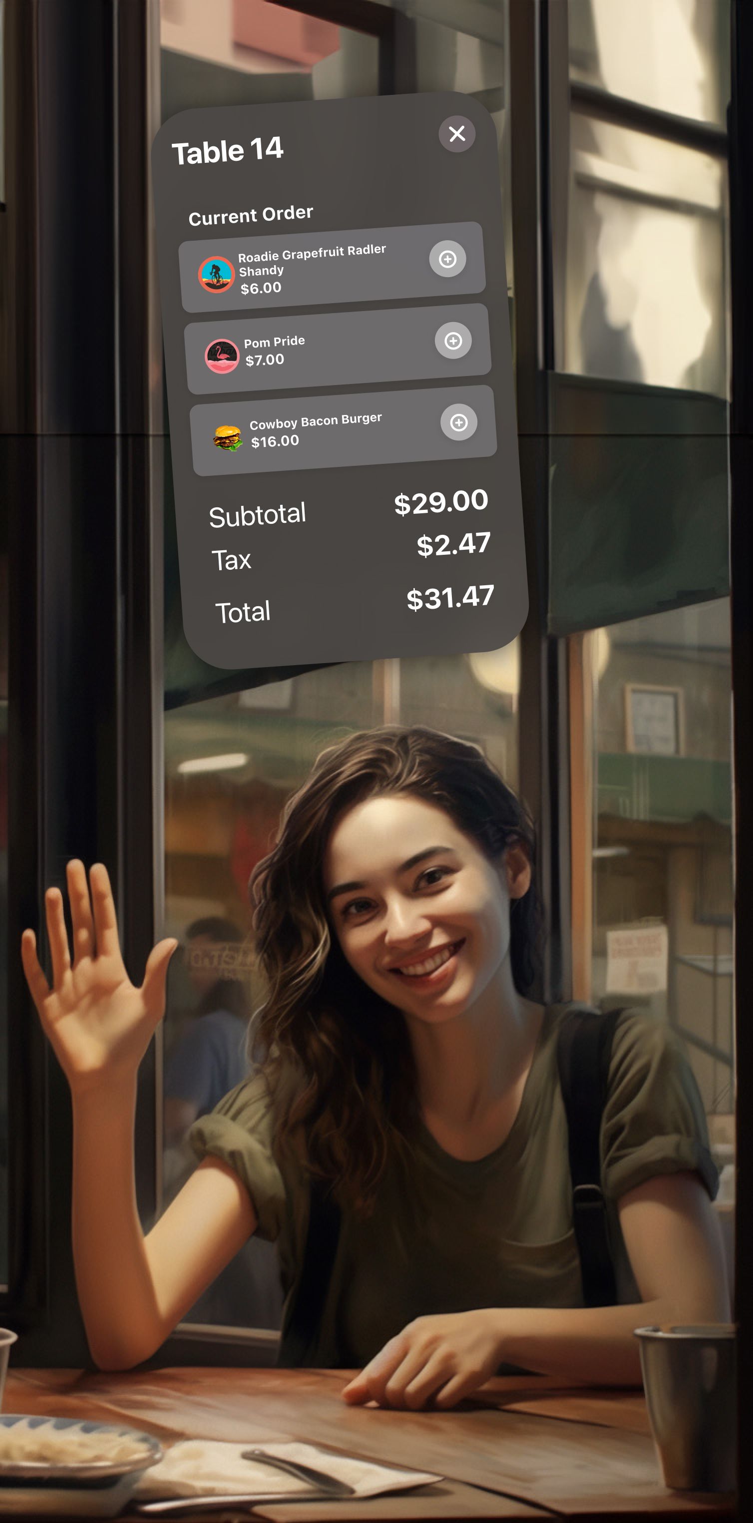 I think it looks great, but it's just an iPad/Mac UI with visionOS styling. Instead, an app like this could take advantage of pinned windows in 3D space and instead it would be more useful to have a window over each table that showed the server the order, as well as timers for how long they have been there and how long it's been since the server last checked in on them.