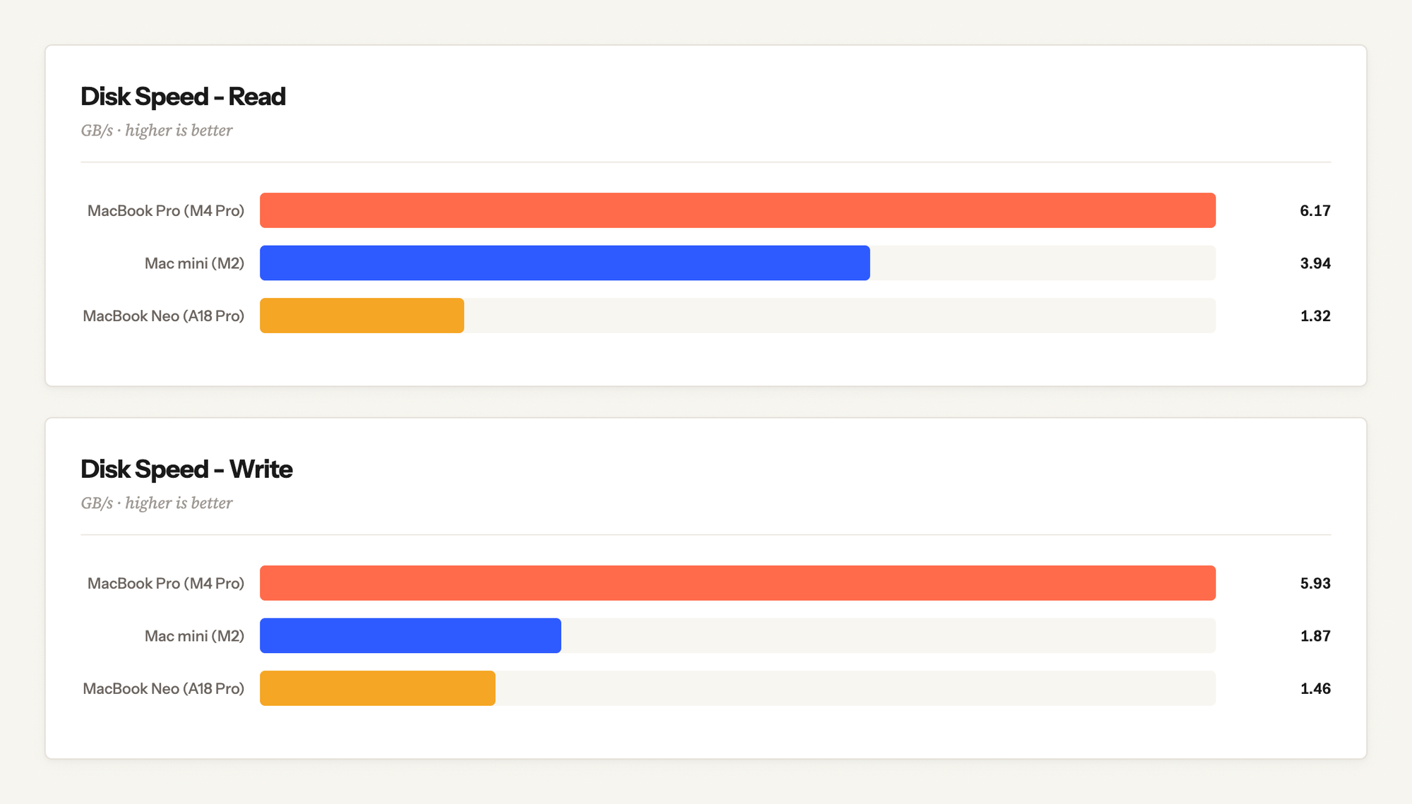I used Magic Disk Benchmark to test the read and write speeds of the 3 Macs I have access to (and can install a random disk app on, aka not my M5 Pro work Mac). As you can see, there's a pretty enormous gap between the Neo and even a base M2 Mac mini.