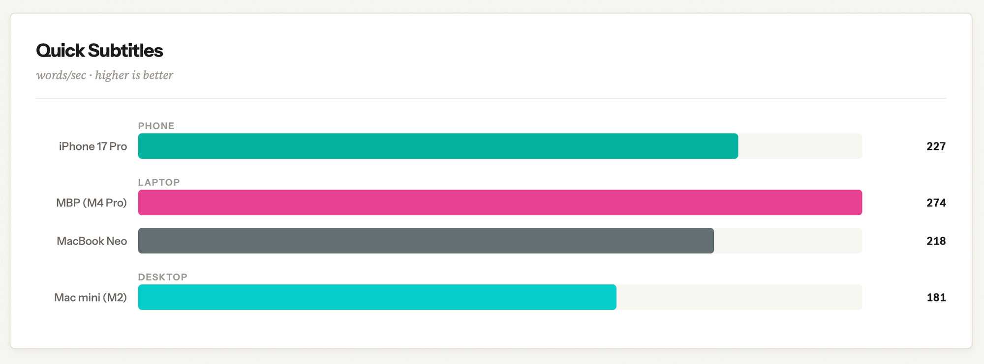 I ran Quick Subtitles' benchmark mode on each device using Apple's transcription model, and this is the words-per-second speed on each device. I think this is an interesting test, although it is quite specialized around one use case. Transcription involves a combination of the neural engine, GPU, and a little CPU.