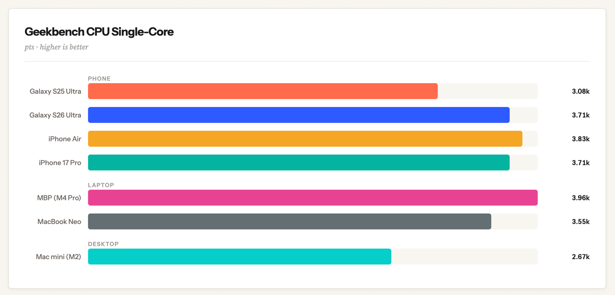 I wrote in my review that I didn't think benchmarks told the real story of using a Neo, and I specifically called out the Geekbench CPU single-core test as particularly misleading. That said, I do think the benchmarks are interesting academically, and in terms of what they say about the differences between Apple silicon Mac chips and iPhone chips.