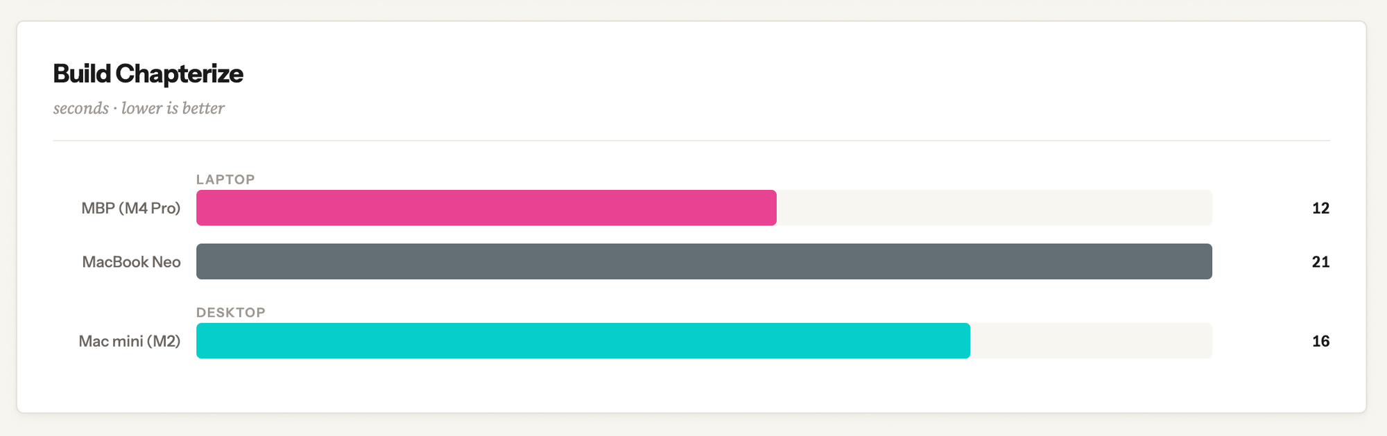 What's notable here is that the enormous increase in CPU and GPU cores on the MacBook Pro don't lead to significant gains in performance in this task, specifically. I can see why Marco thinks the M4 and M4 Pro are quite similar if this was his main benchmark when developing Overcast's awesome new transcription feature. In fact, the Neo is really competitive here, finishing the task slower than a high-spec Mac, but not by a huge amount. I think this test shows clearly how important the neural engine is in this task, and the Neo's quite modern one helps it churn through this work quite well.