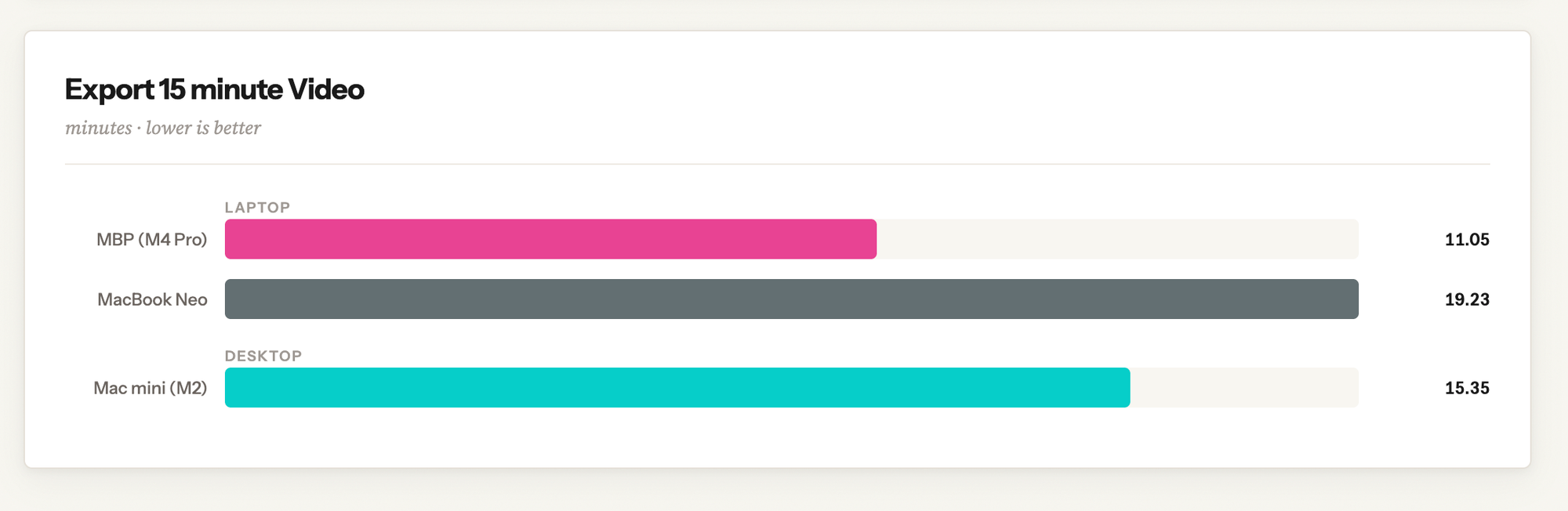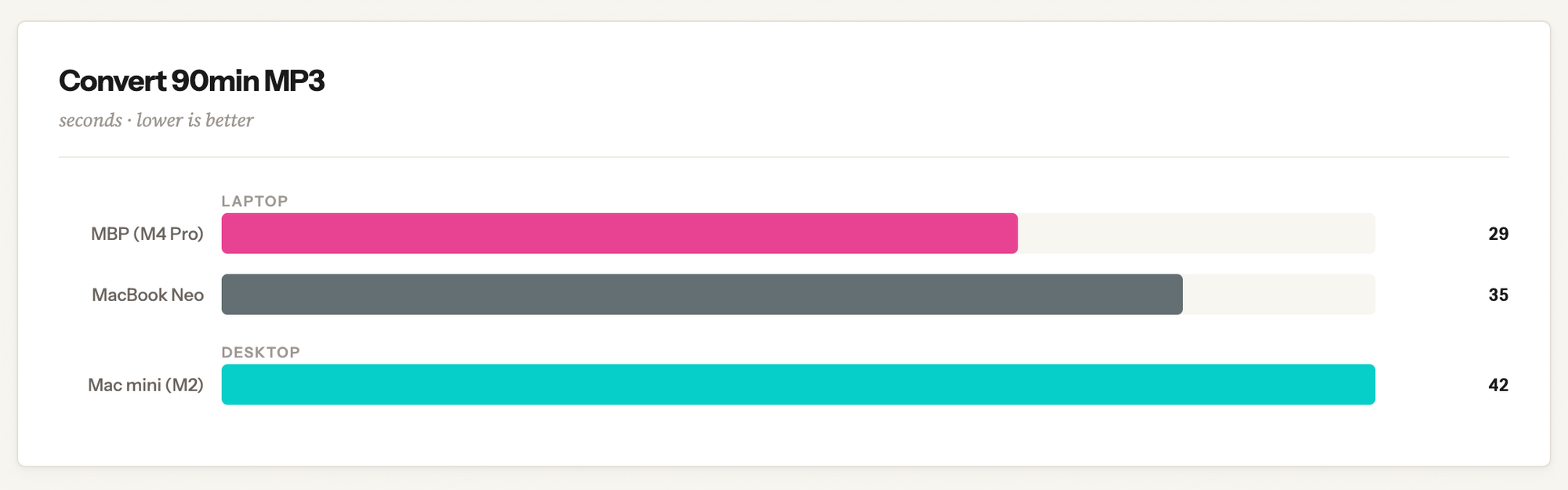 Audio conversion is a pretty straightforward single-core task on the CPU, and as you might expect, the Neo punches above its weight here, using one of its performance cores to its fullest to perform a task just seconds slower than a much more expensive Mac.