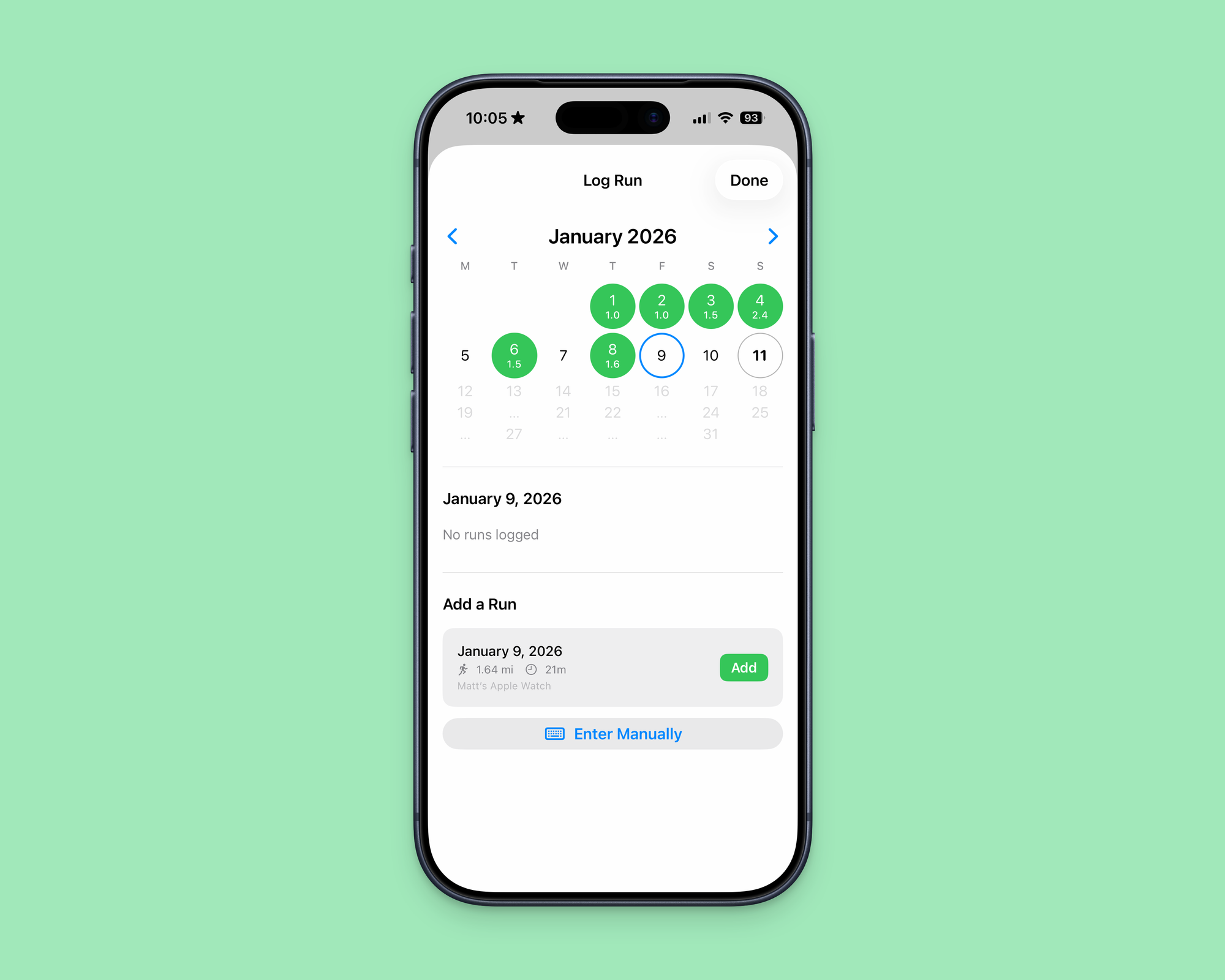 The logging interface is also simple. It uses the same calendar view, with HealthKit integration to pull my running workouts and add them with a single tap. I added a little flourish to this, so the logging UI kind of slams down into place, which I thought was fun. I can also manually enter a workout if I didn't track it through my fitness app for some reason.