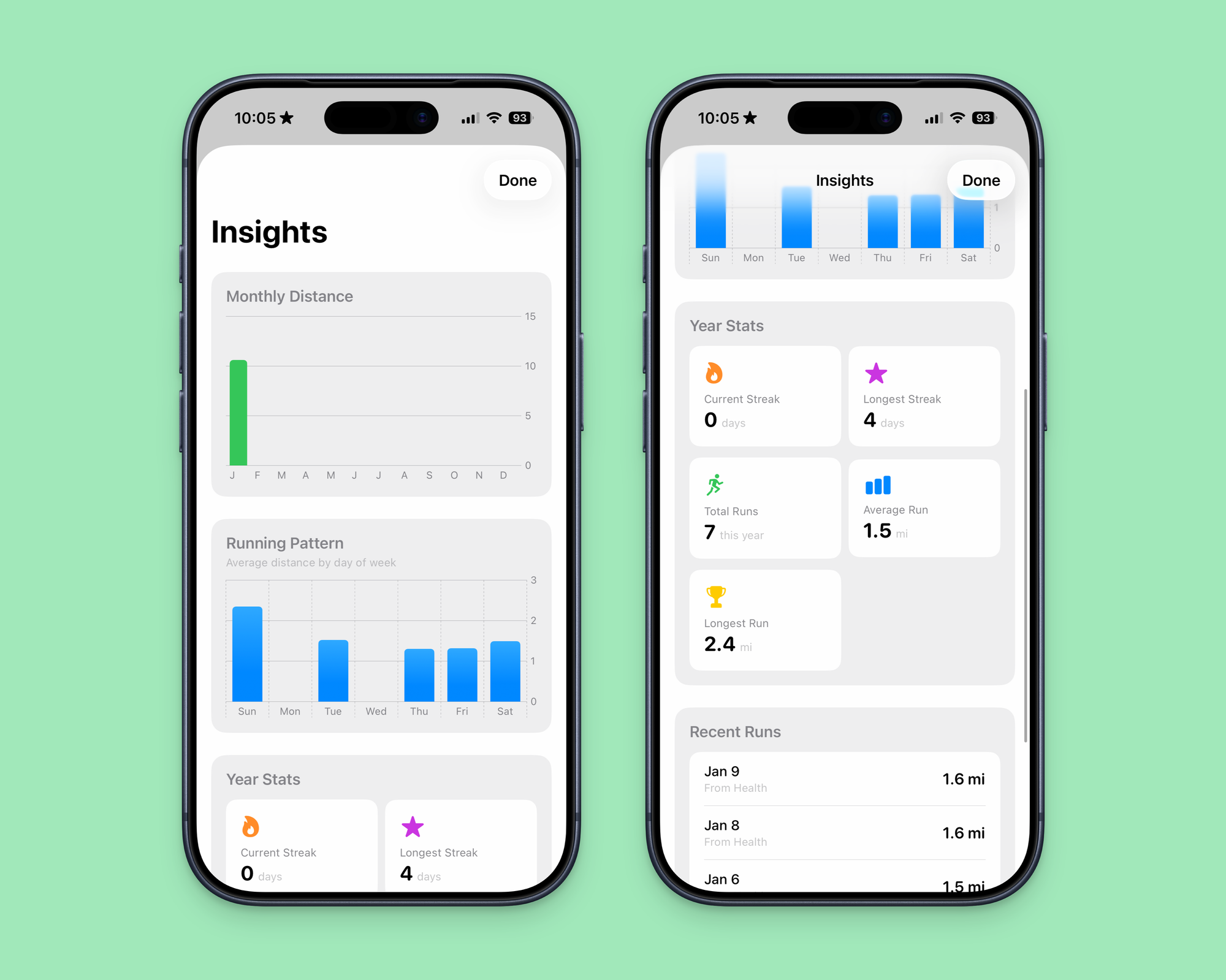 The only other feature is an insights page, which shows metrics like distance by month, distance by day of the week, longest streak, longest run, average run, and so on. There's also a settings page where I can set the units between miles and kilometers and set my goal for the year.