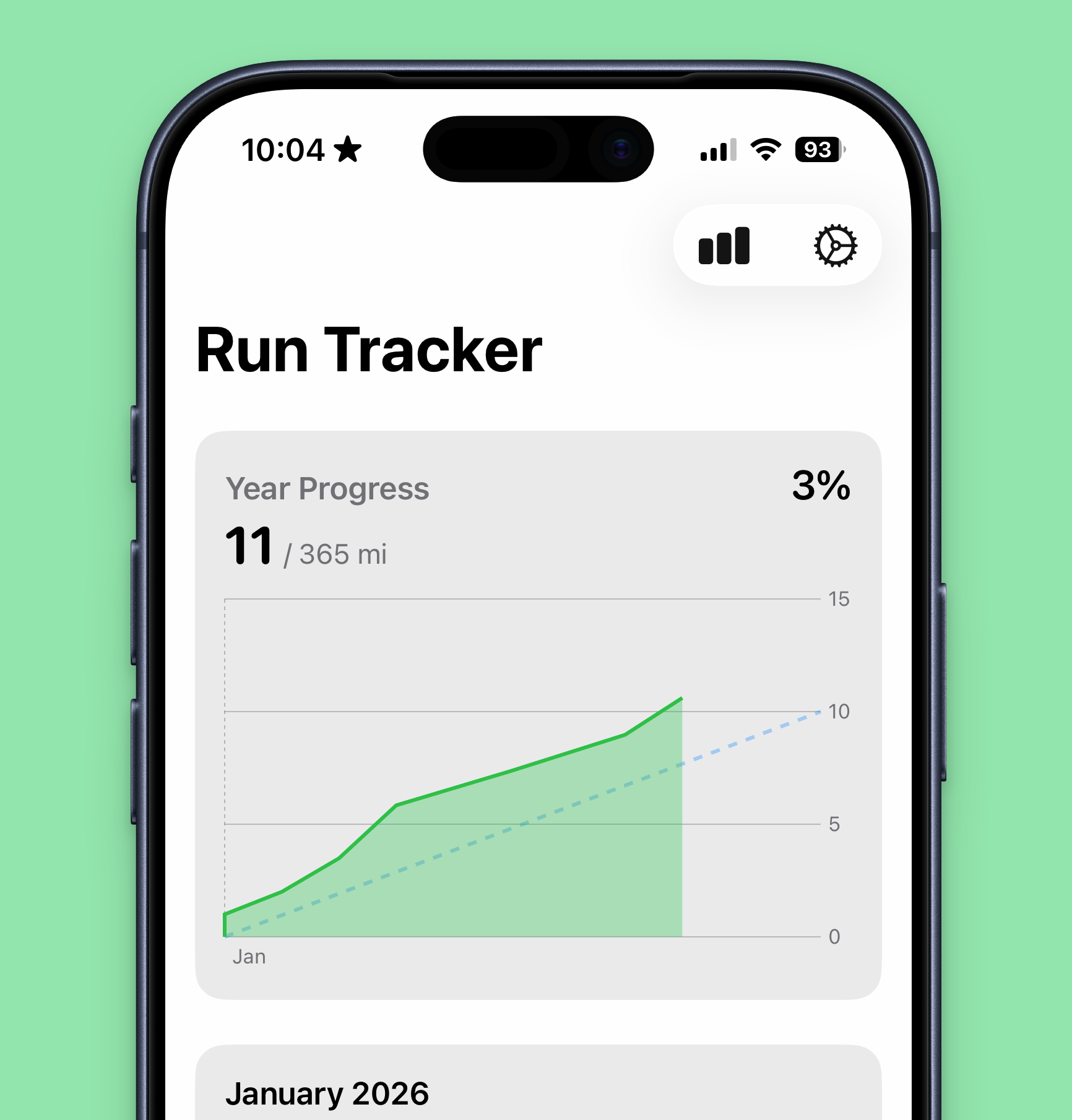 The app does precisely what I want it to do: track my progress toward running 365 miles in 2026. I wanted a simple way to visualize my progress throughout the year, so I created a graph showing the days of the year and tracking my progress against a target line. If I'm above the line, I'm on track. If I'm below the line, I need to catch up.