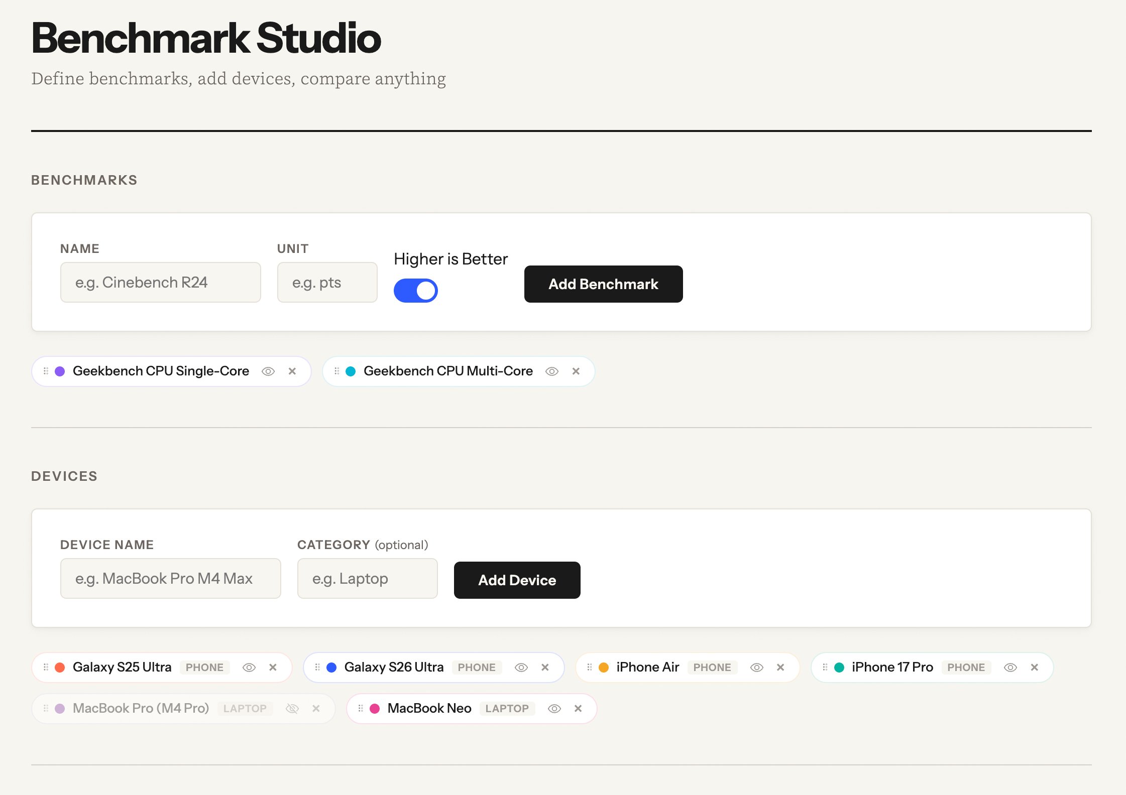 The UI for adding tests and devices is simple, allowing you to create tests and add devices with categories, so that things like laptops and phones can be separated. You can also drag to reorder them or toggle their visibility.