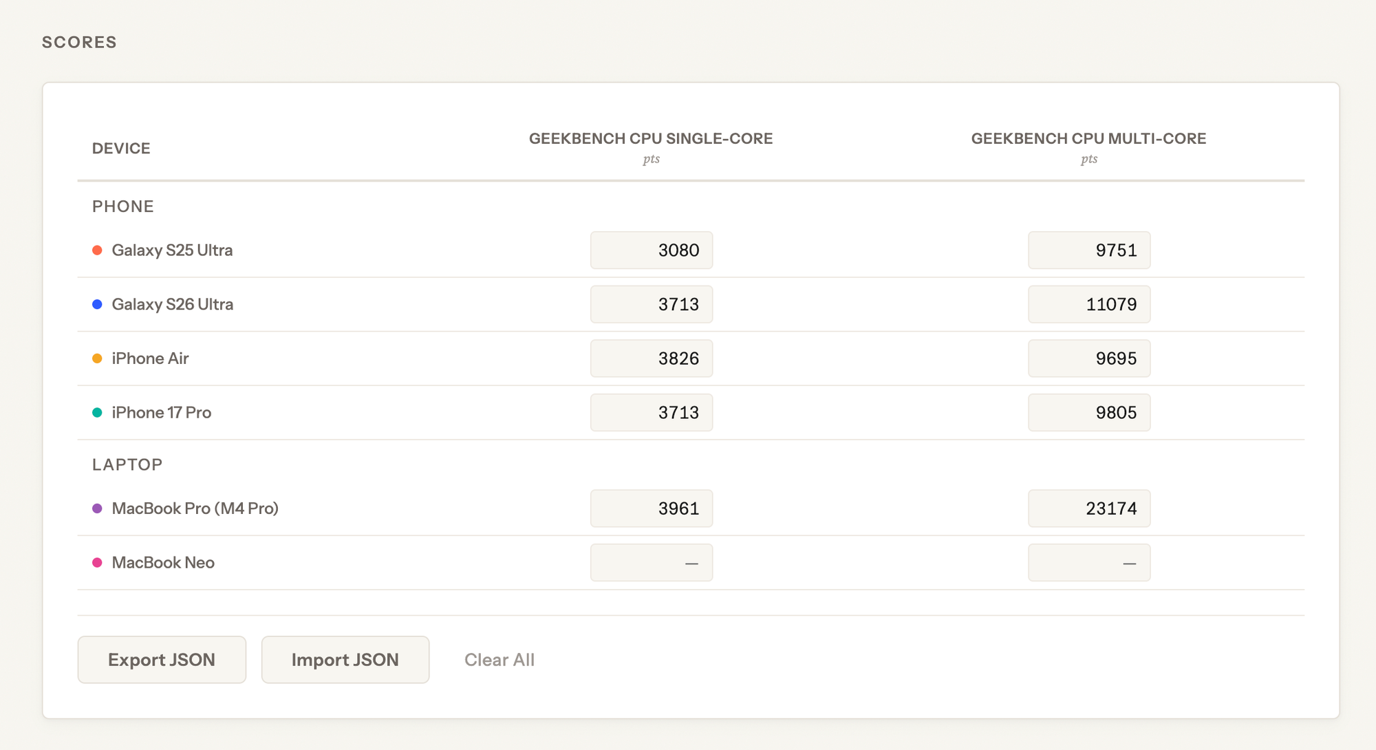 There's a simple table for entering the scores for each device, and you can import or export the current page's values as JSON. All data is stored in your browser's localstorage and never leaves your device. Good for privacy, and good for my back end costs 😉