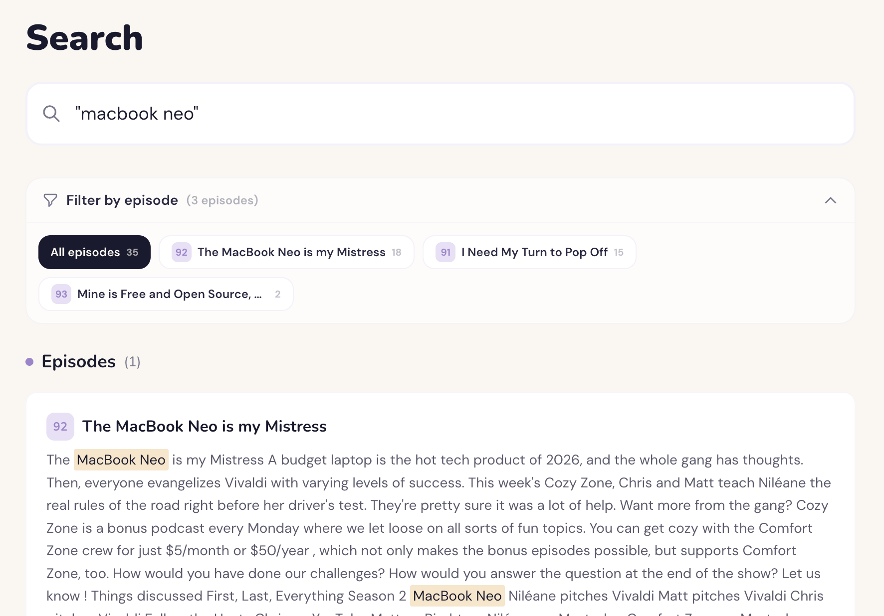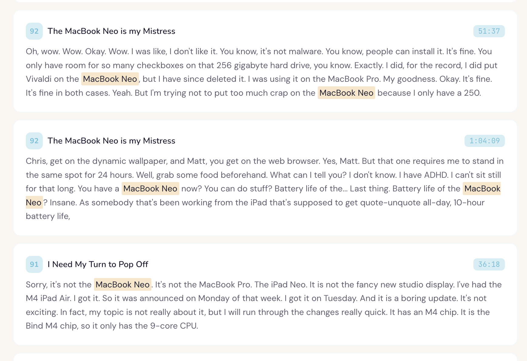 Using this website, I can instantly find all the episodes were we talked about anything I want. I'll put a video below showing how it works, but this has instantly removed basically all friction in finding what we discussed. For example, I'm able to quickly see all the episodes we mentioned the MacBook Neo.
