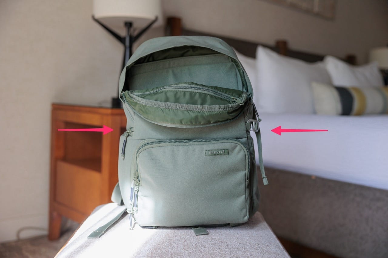 I can fit it in horizontally if I want, and while it does push the bag out a bit, it also gives some more space above for something else. I’ve tried to put arrows on the image to give you an idea how high it goes when placed sideways.