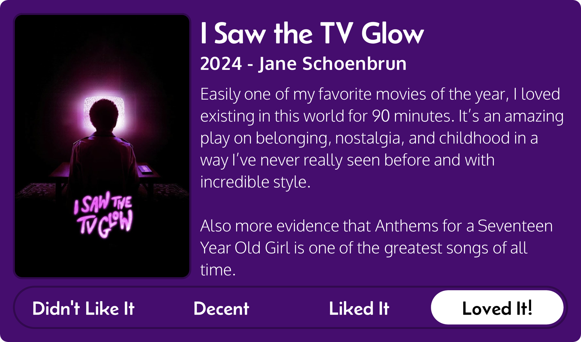 Easily one of my favorite movies of the year, I loved existing in this world for 90 minutes. It’s an amazing play on belonging, nostalgia, and childhood in a way I’ve never really seen before and with incredible style.