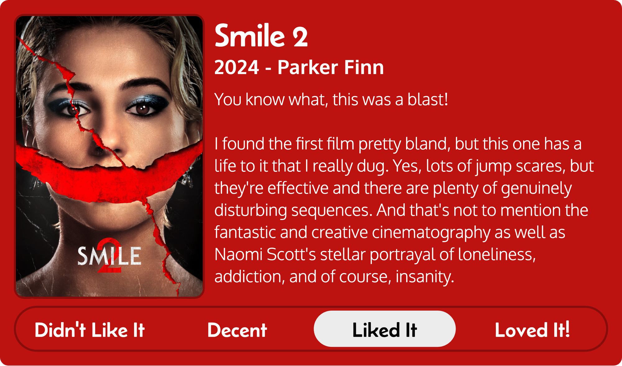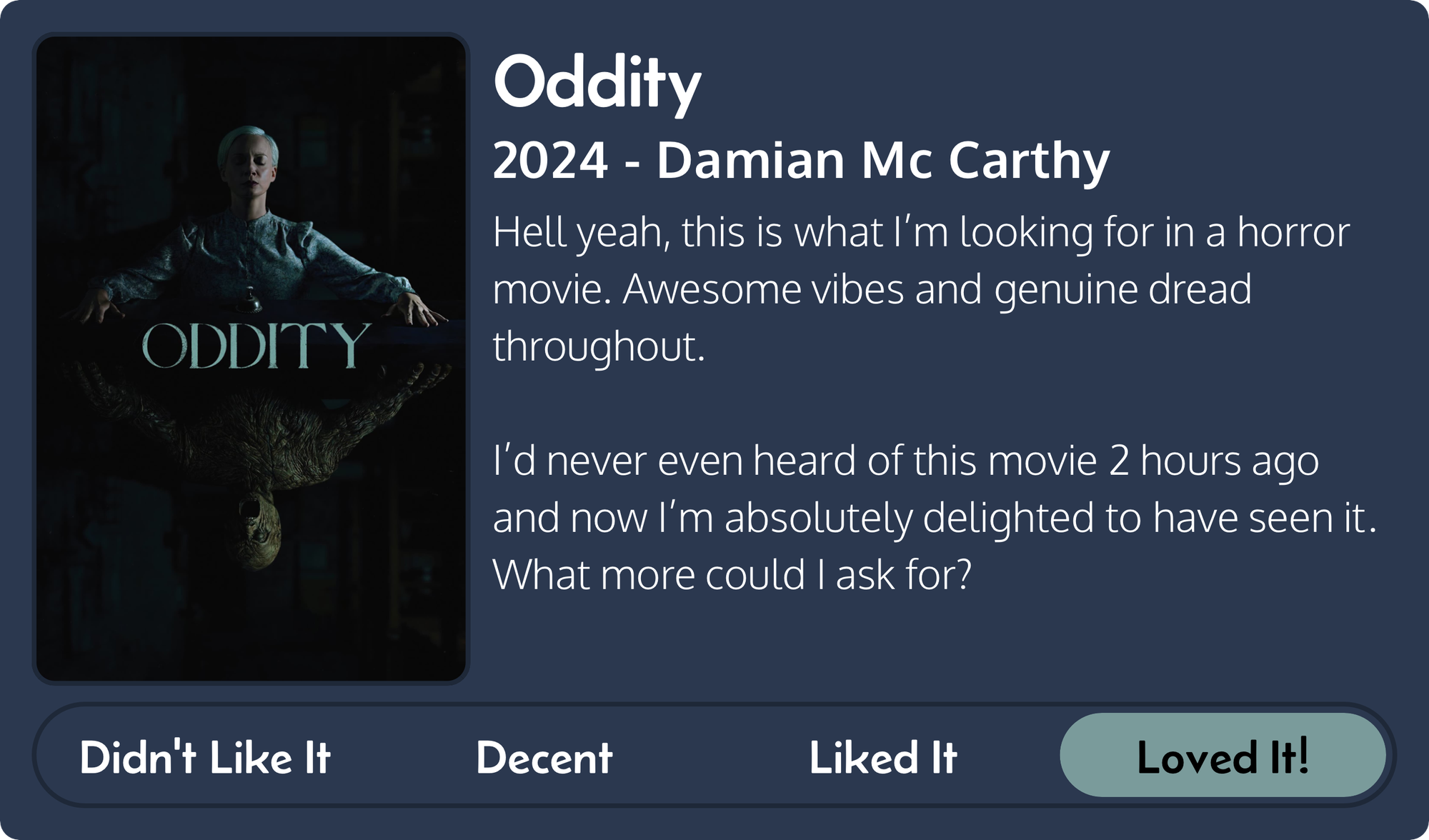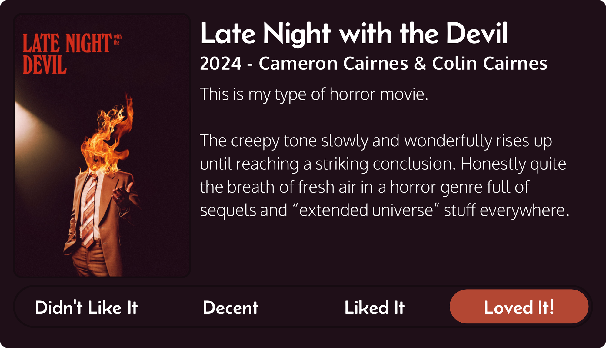 Hell yeah, this is what I’m looking for in a horror movie. Awesome vibes and genuine dread throughout.