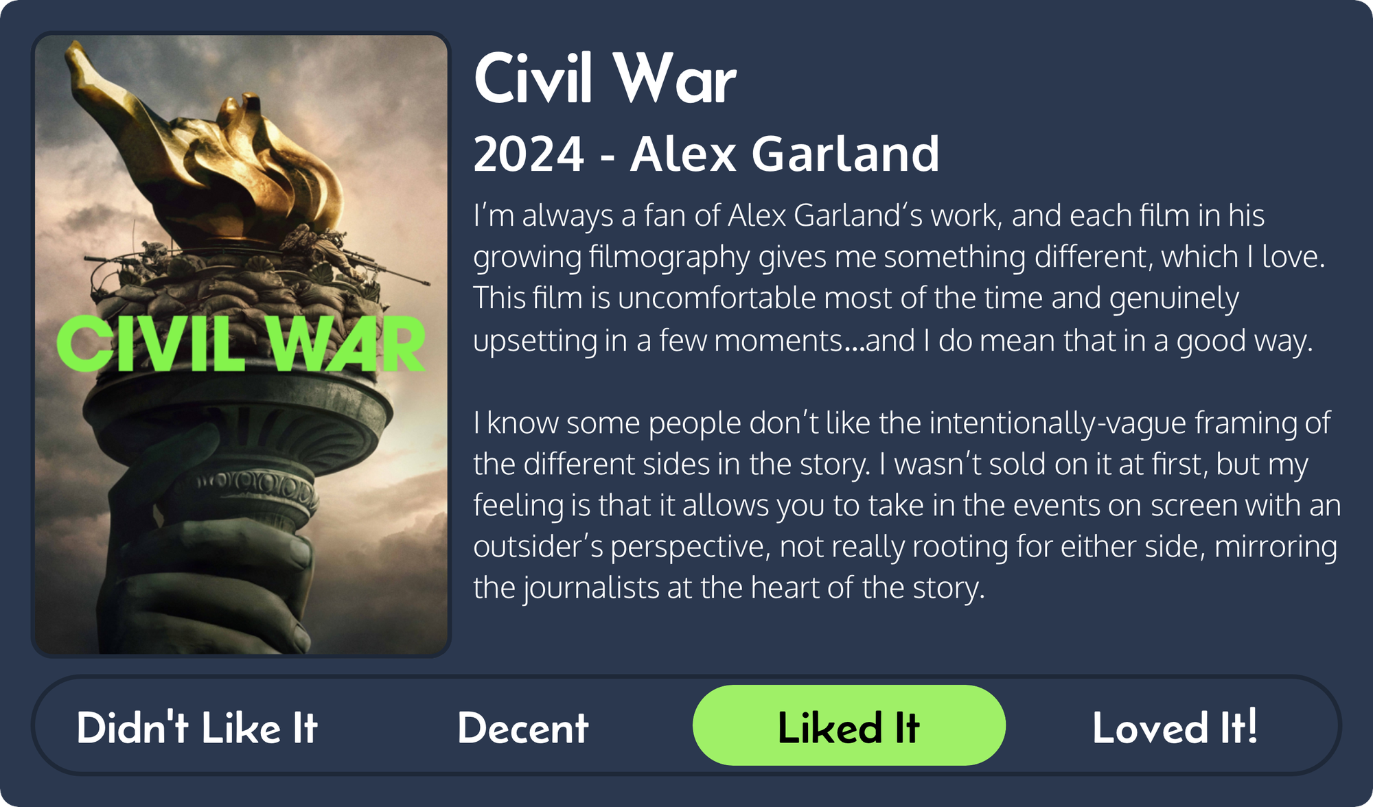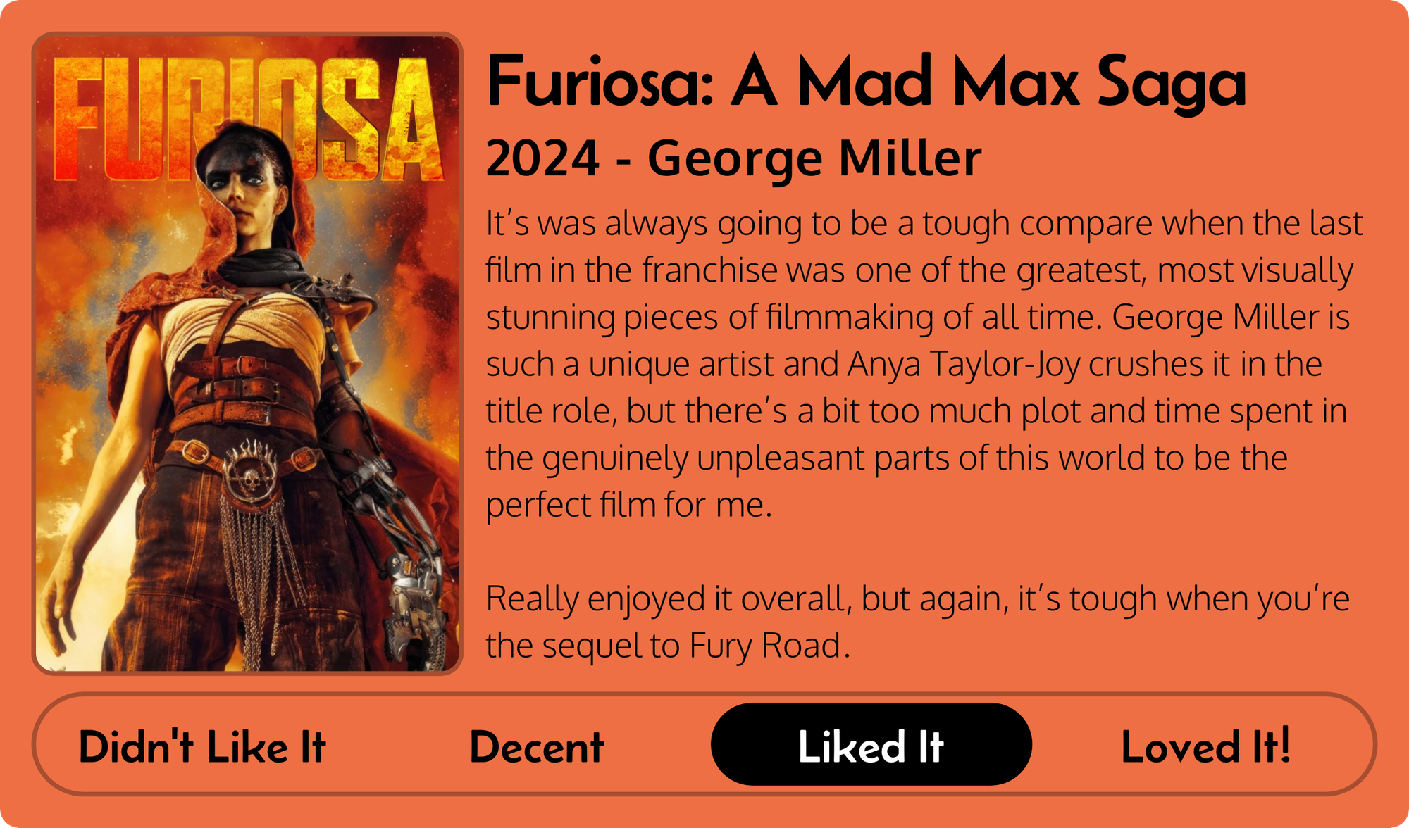 I’ve watched 48 new release movies in 2024, and with just a few weeks left in the year, I wanted to make what is my current top 10 (plus honorable mentions & worst movies). As we get to the end of the year and you might have some free time to watch some things, hopefully this list will be helpful!
