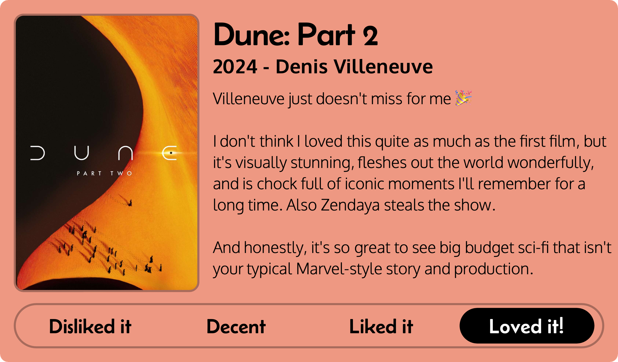 I don't think I loved this quite as much as the first film, but it's visually stunning, fleshes out the world wonderfully, and is chock full of iconic moments I'll remember for a long time. Also Zendaya steals the show.