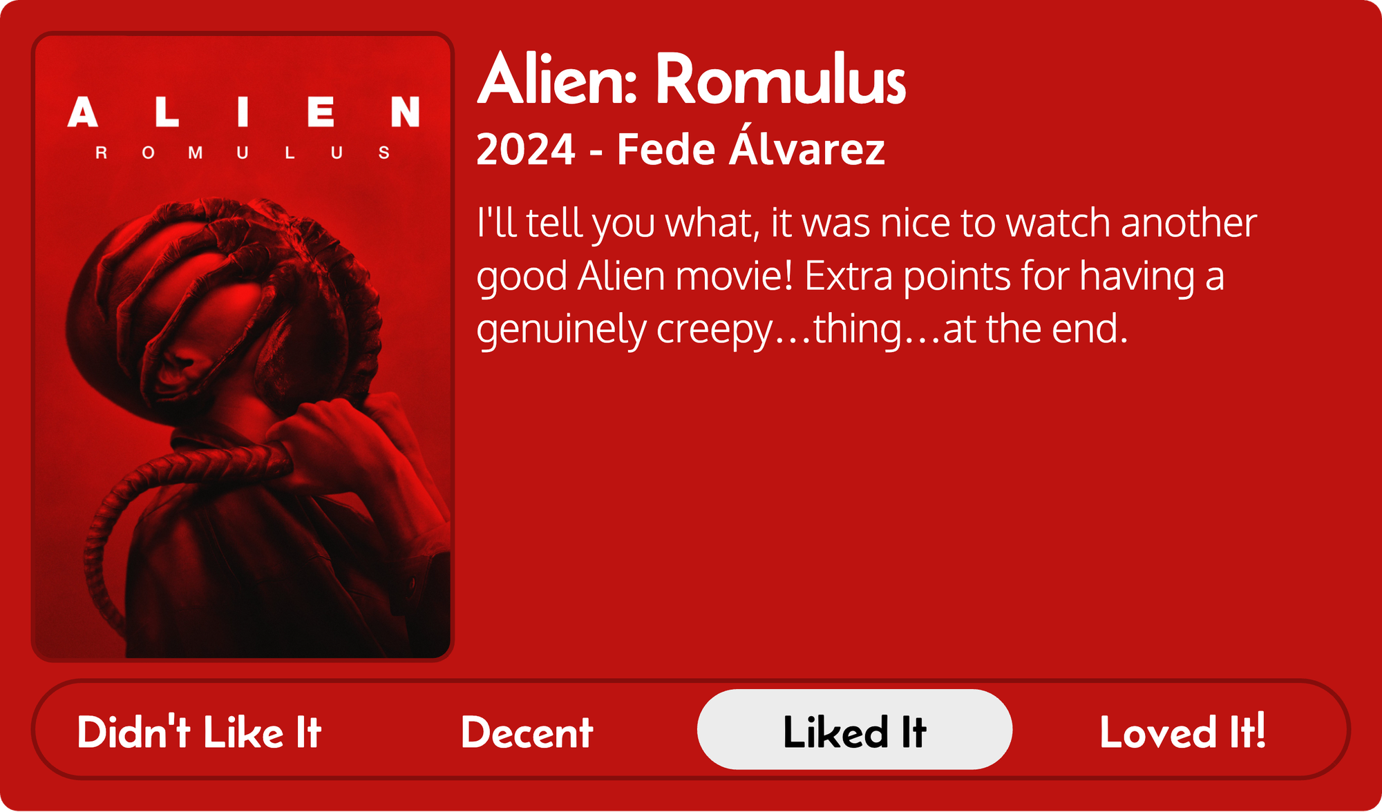 I'll tell you what, it was nice to watch another good Alien movie! Extra points for having a genuinely creepy…thing…at the end.