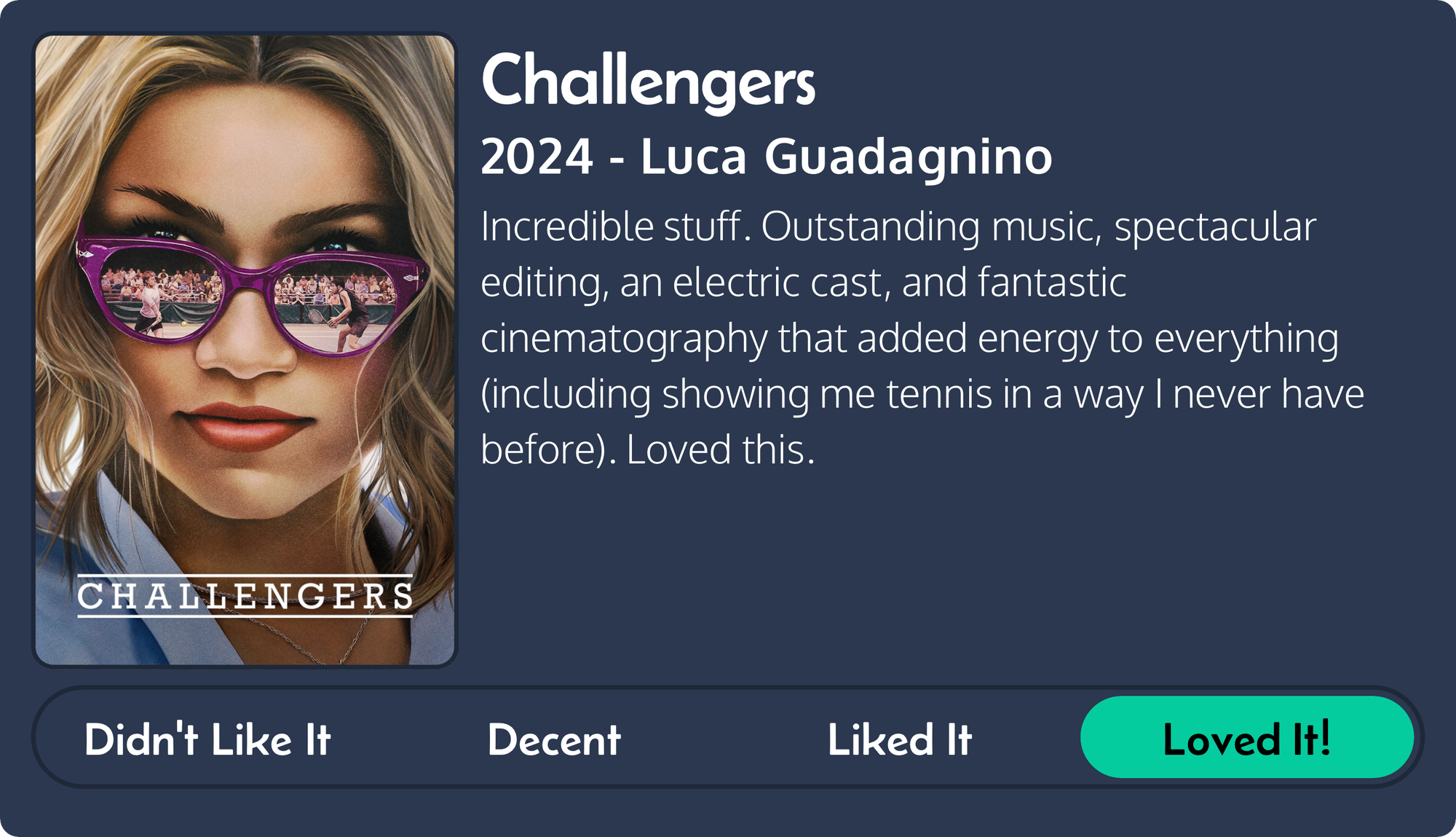 Incredible stuff. Outstanding music, spectacular editing, an electric cast, and fantastic cinematography that added energy to everything (including showing me tennis in a way I never have before). Loved this.
