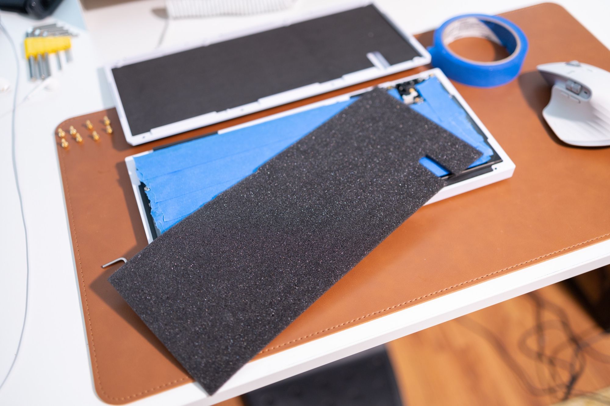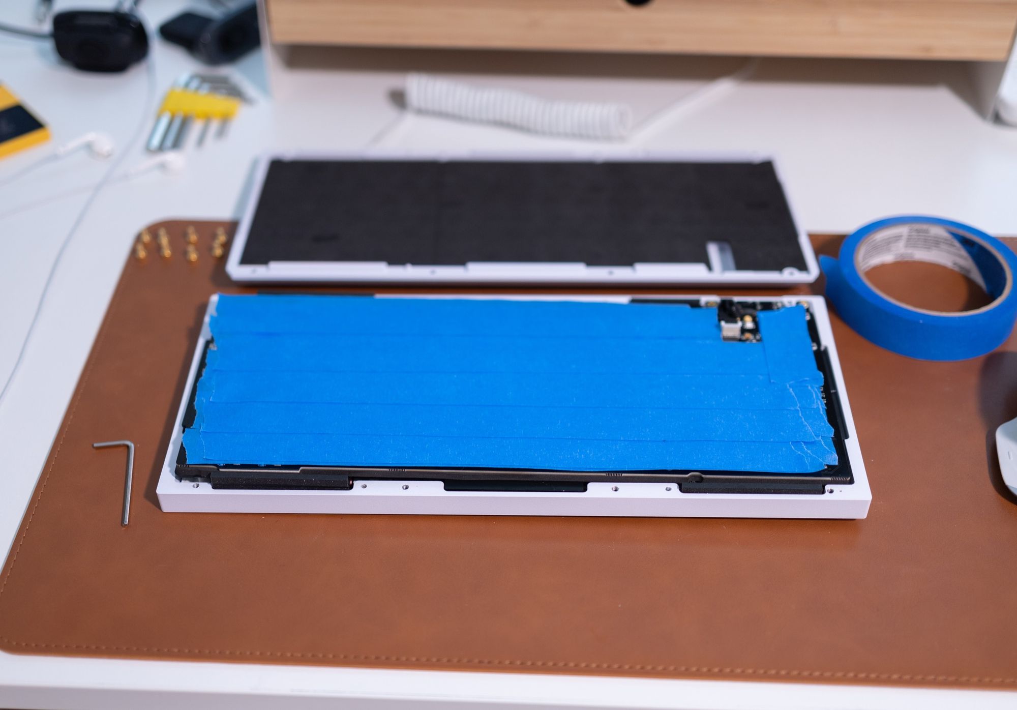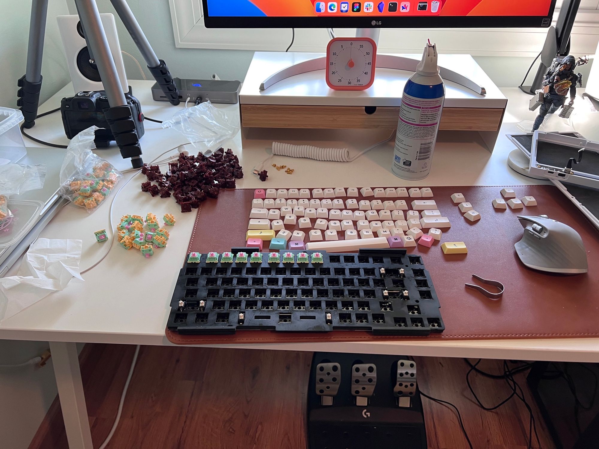 I got the Q1 with Gateron browns, but I wanted something different, and I got the Magic Girl Classic switches which I was able to get onto the keyboard pretty easily. This was definitely more work, and this is what my desk looked like while I was working on this: