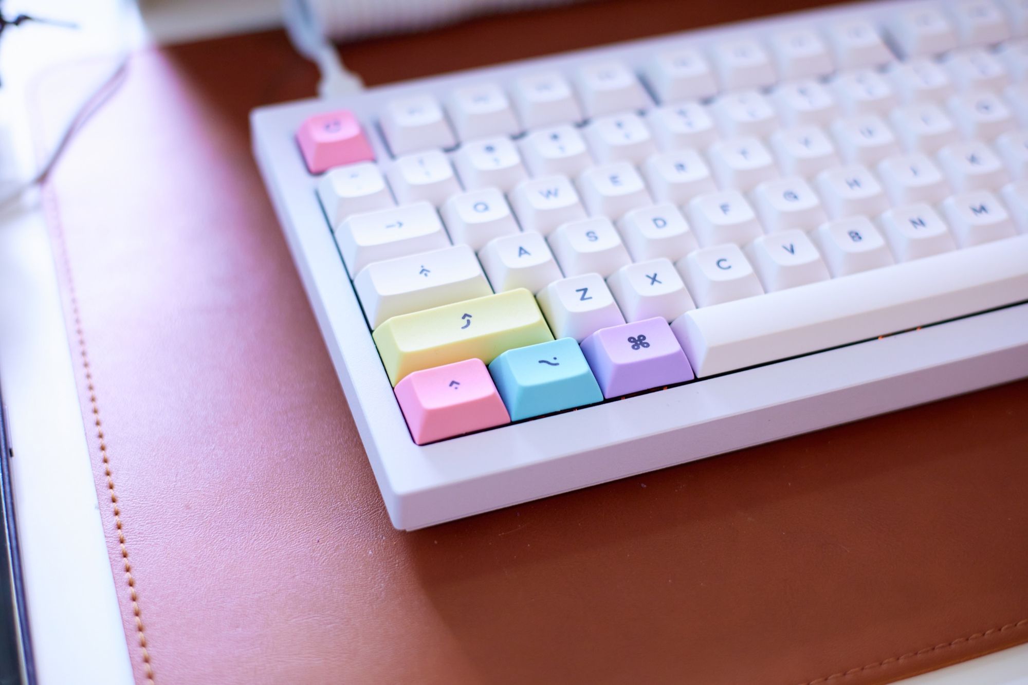 These are the DSA Milkshake key caps with the addons set , and in my opinion they look absolutely incredible. I smile every time I see this keyboard. These were stupid-easy to add, as you can pull off the key caps with your fingers if you want and just press these on.