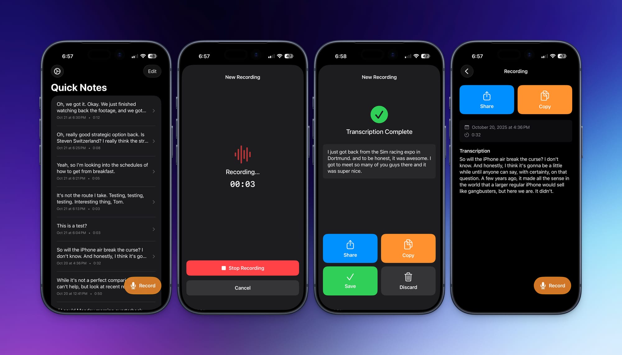 As I revealed to More Birchtree subscribers a few days ago, I had a problem where I liked to compose blog posts while I walked my dog, but I found it hard to type while on the go. iOS’s built-in dictation should help me here, but I find it pretty terrible so I don’t like using that. However, Apple just released this really nice, local transcription tool in iOS 26 and I happen to already know how it works due to my Quick Subtitles app. What if I could just dictate a blog post into my phone, get a high quality transcript, and paste that into my writing app? Sure, I'll have to edit it a bit, but I'll be 90% there.