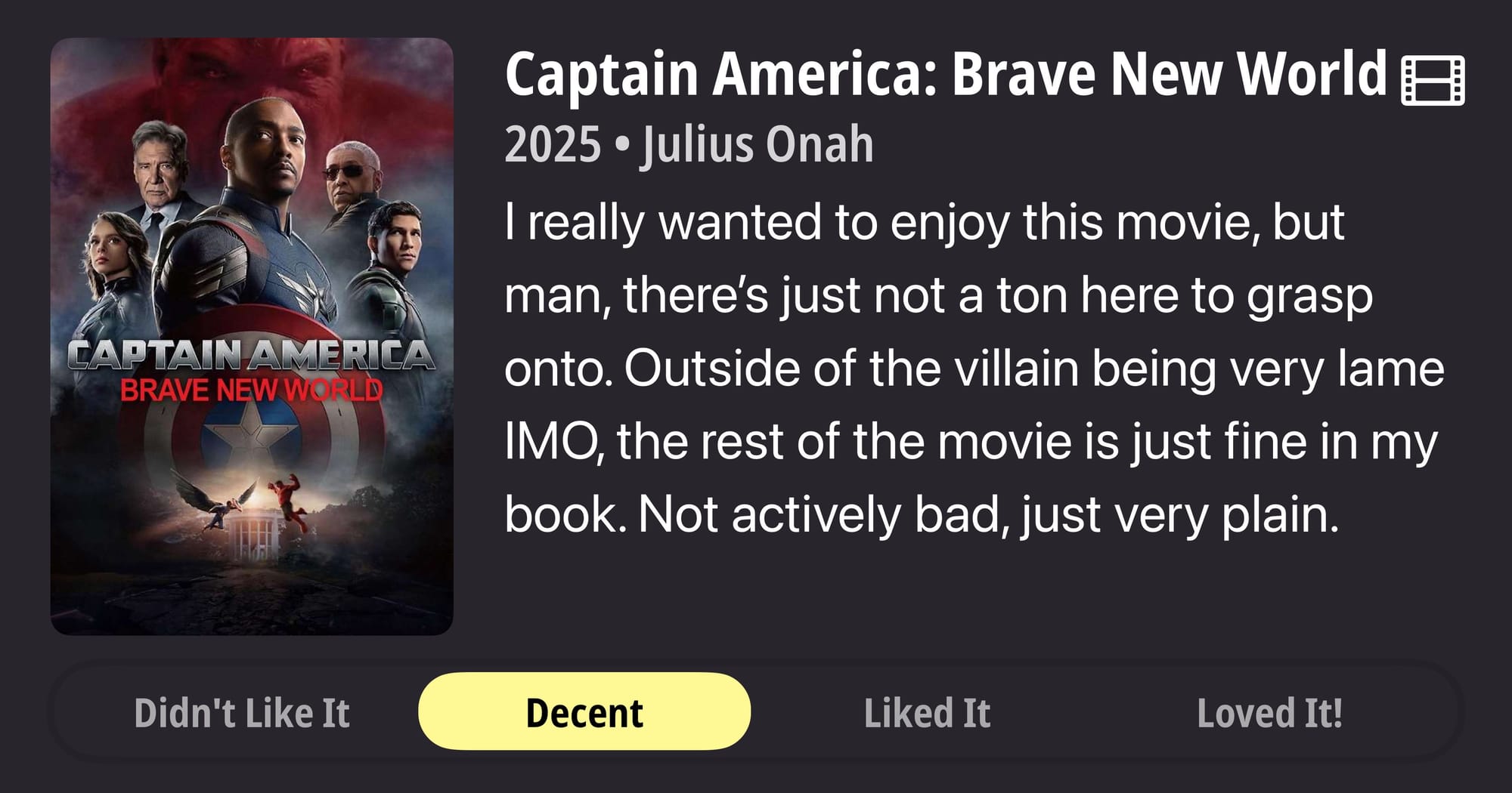 This fell into the "I wanted to see it, but poor reviews shooed me away" category, and thinking back on this movie a few days later, I kinda think I went easy on this one, but the latest Captain America just didn't do it for me. I called it "very plain" in the review and I think that tells the whole story for me; it's only been a few days and I barely remember most things from this story. It's always fun to see Harrison Ford as the President and Anthony Mackie always has a great presence on screen, but that wasn't enough to hold my interest.