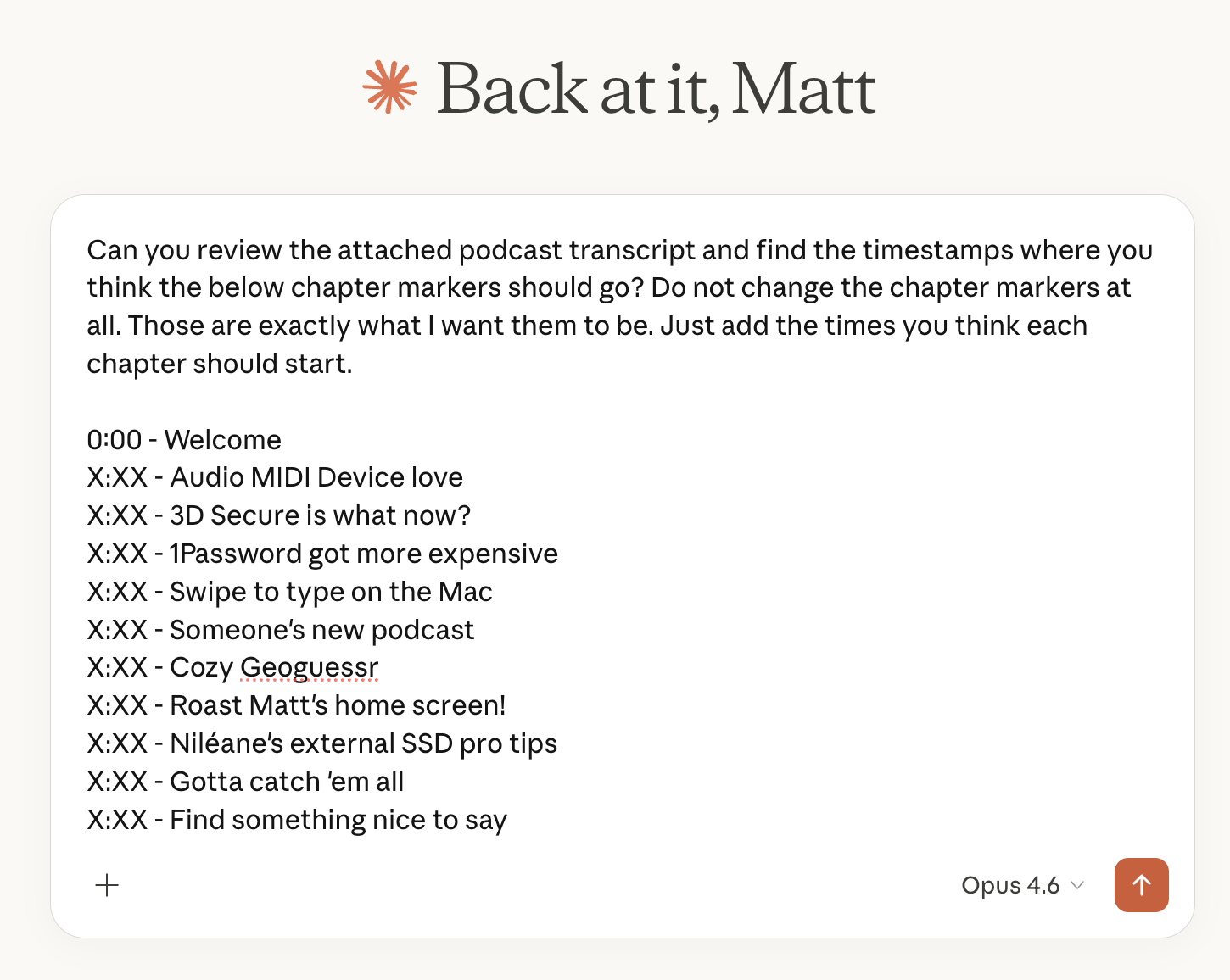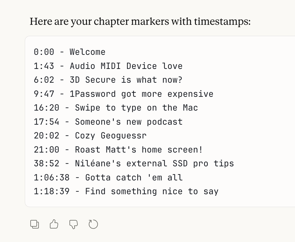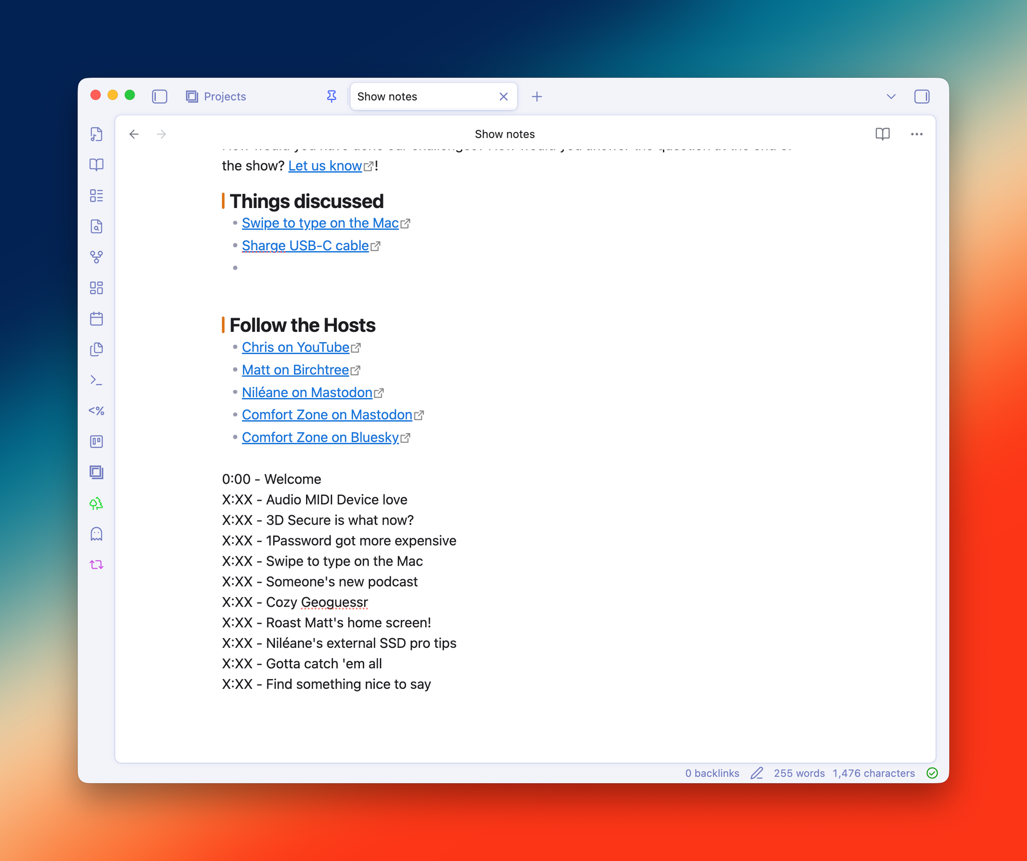 The best thing you can do to speed up this process is to write down what chapter breaks you want as you record. I do this in Obsidian, which is the app I use to write the show notes, and I just have a little section at the bottom as we go where I write down the chapters. We edit the podcast, so I don't know exactly what the timestamps will be when I'm recording them, but just having them in order is helpful.
