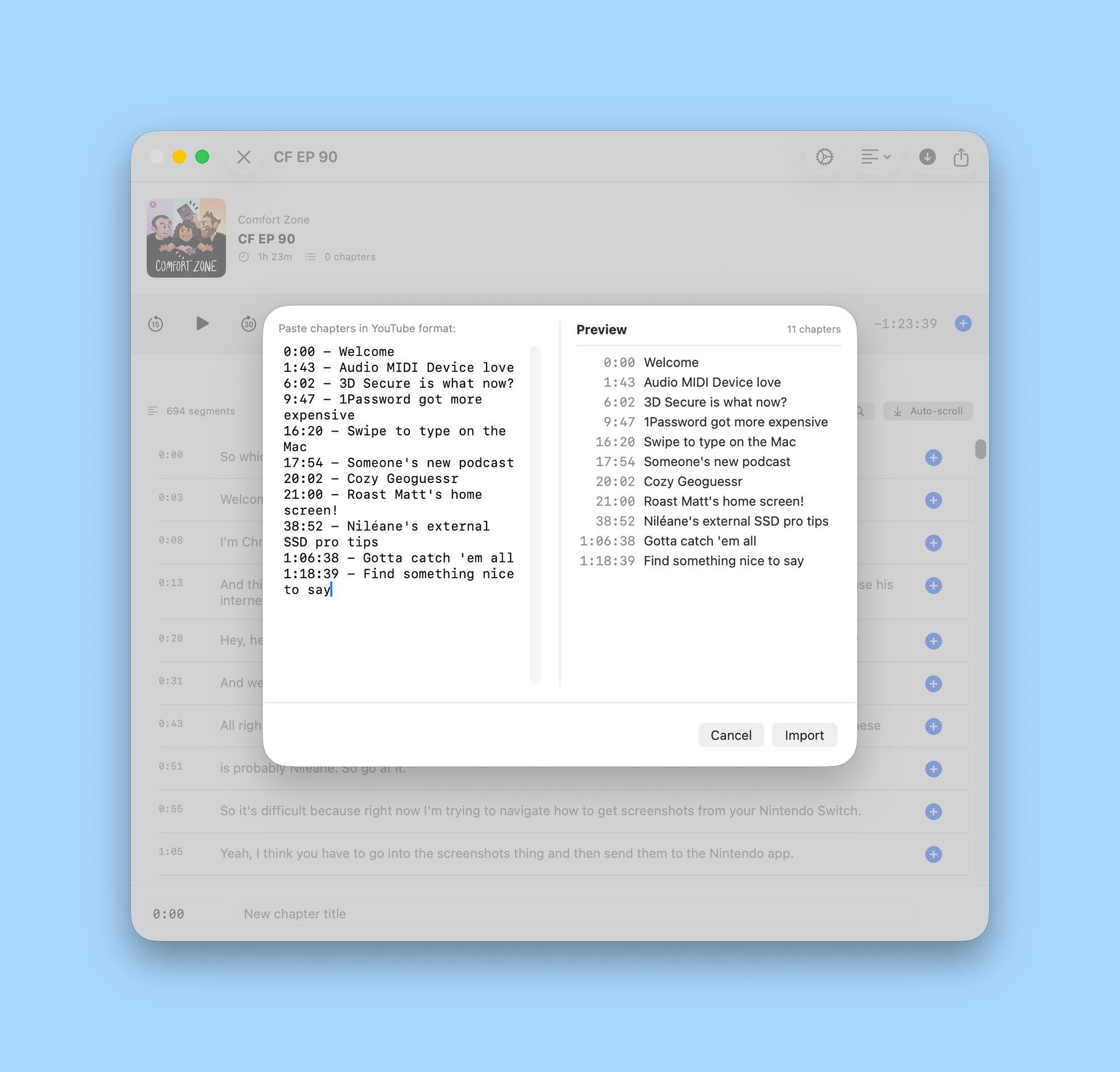 Now you can drag your audio and .srt files in ChapterPod, and hit Command + i to import chapters from text. That will give you all your chapters ready to go.