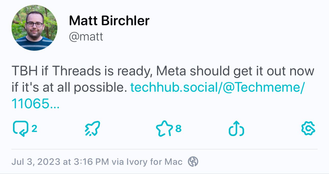 For now, Threads is my way to keep up with some more popular accounts that never made the move to Mastodon, but as soon as that ActivityPub integration turns on, I hope to uninstall the app and just follow along in Ivory.