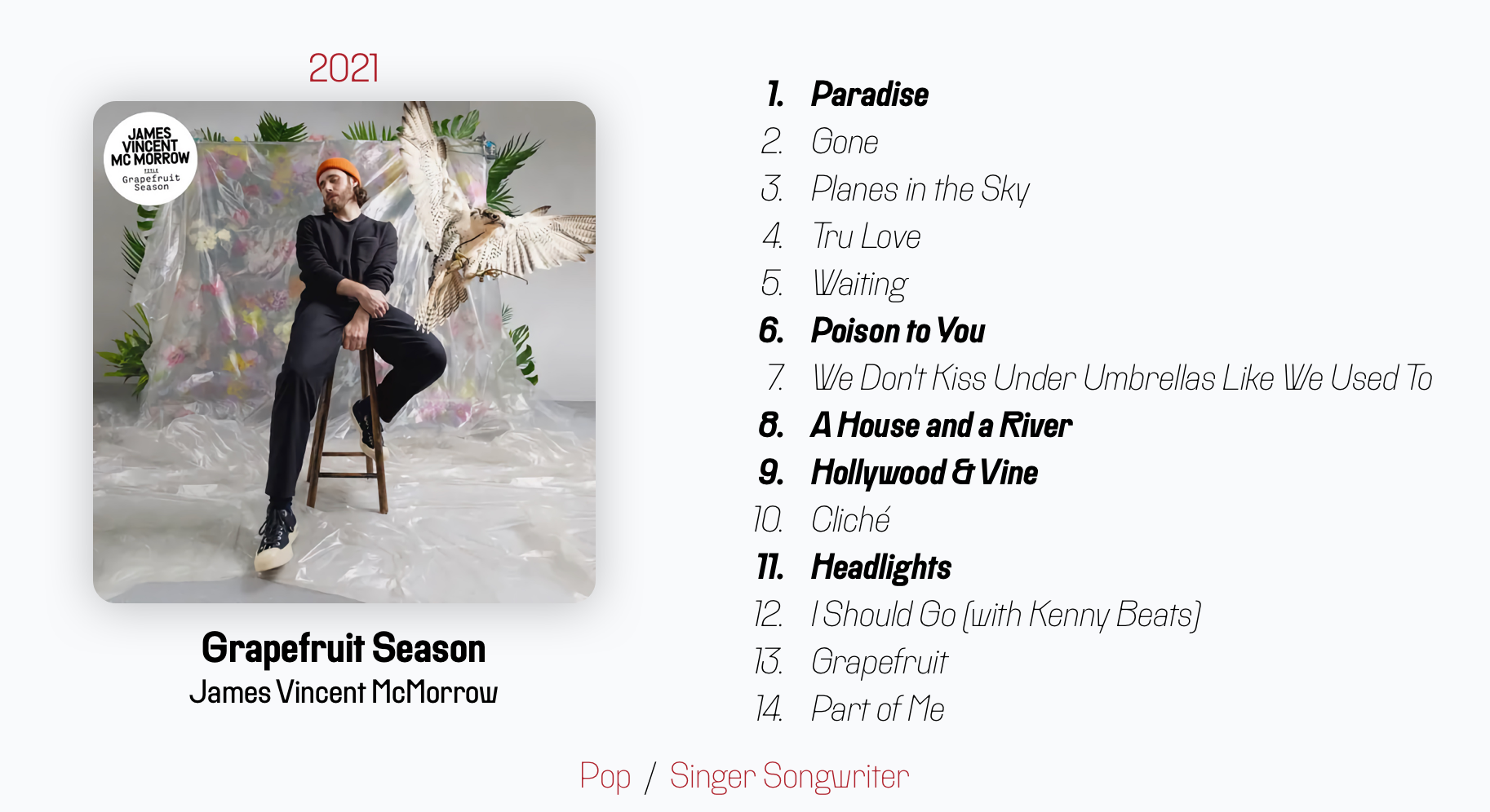 James Vincent McMorrow has been on my radar since 2013 when he had some serious Bon Iver vibes, but he's shifted since then to be more distinct, and Grapefruit Season was exactly my vibe last year.