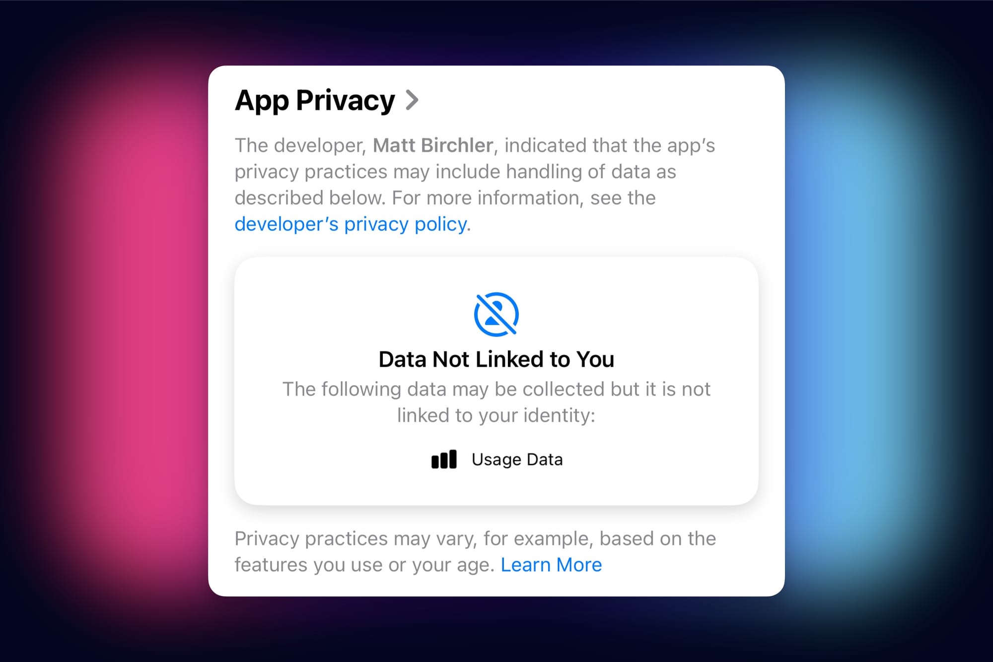 You’ll see this in the app privacy section, which indicates some data is collected, but it’s not linked to the user. In the interest of complete transparency (as I like to do), here’s what’s logged to my server: