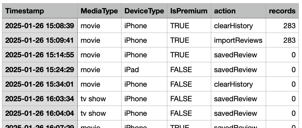 Basically, when you save a new review, I get a log for what media type it was, what device you were using, and whether you are a premium subscriber or not. I also have logs for imports, exports, and history deletions, as well as counts on each of those to know how many records were added, deleted, or exported.