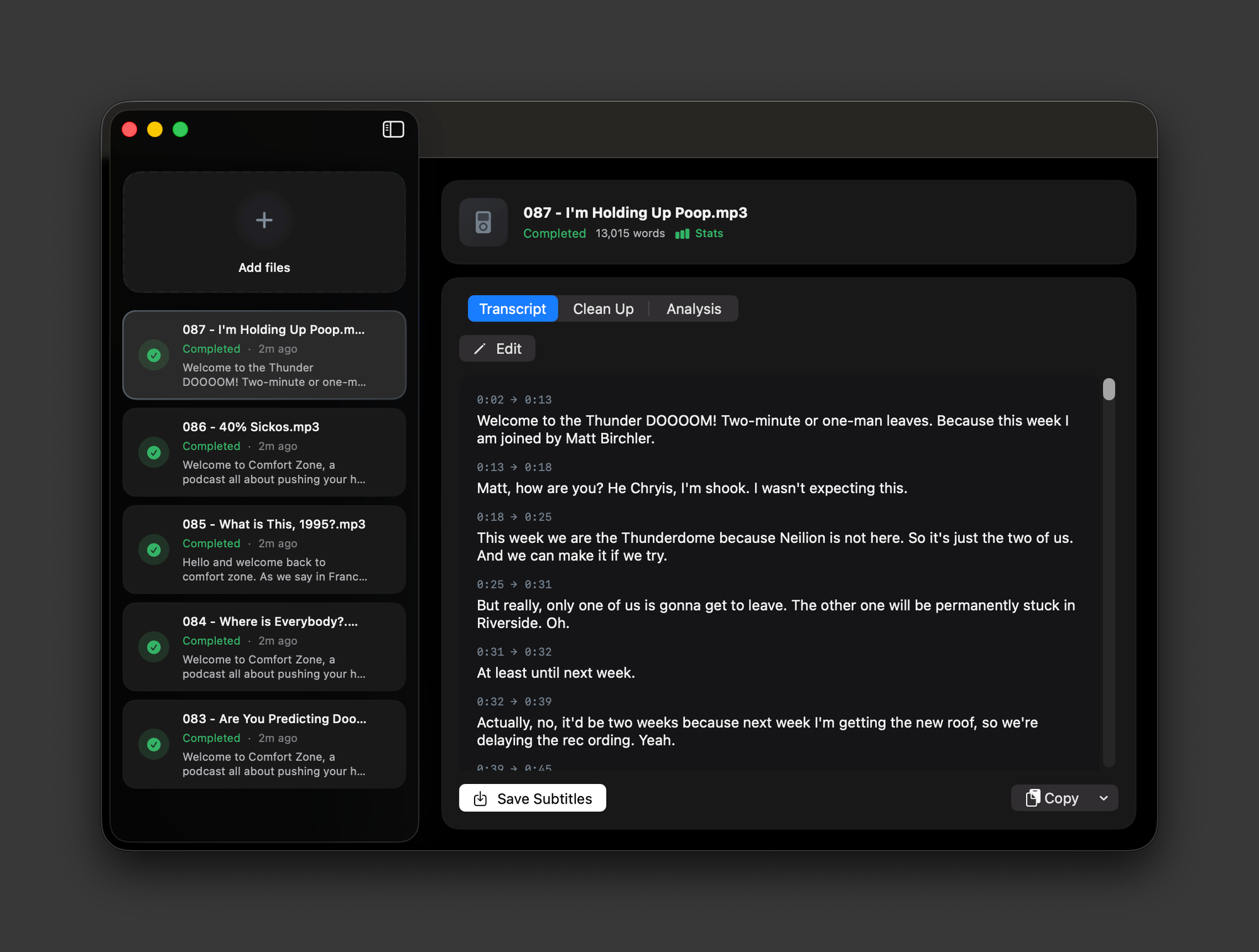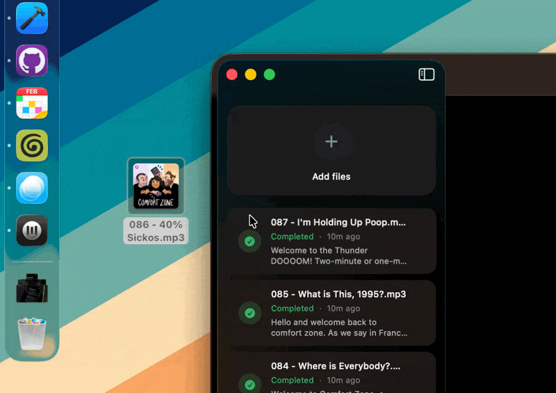 You can also drag files directly onto the dock icon to start transcribing them immediately, which makes it easy to kick off a new project without even opening the app first.